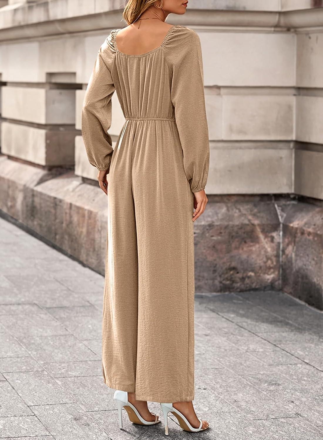 Dokotoo Women’s Casual Loose Overalls Jumpsuits One Piece Long Sleeve Wide Leg Pant Rompers With Pockets(Parchment)