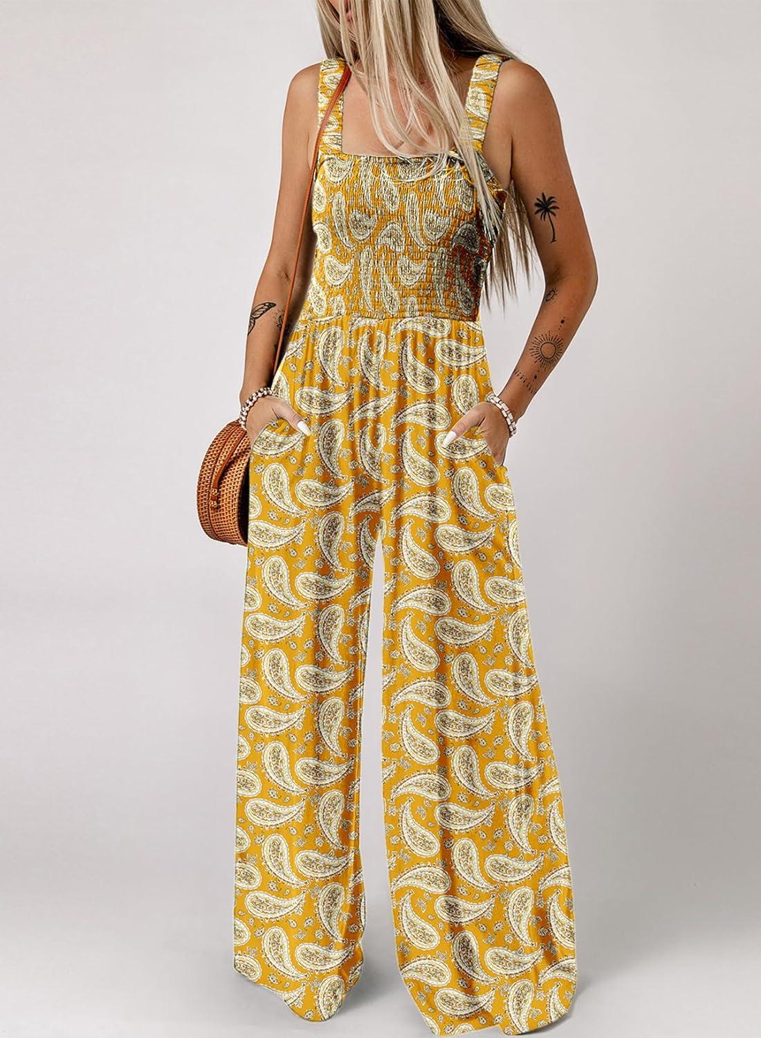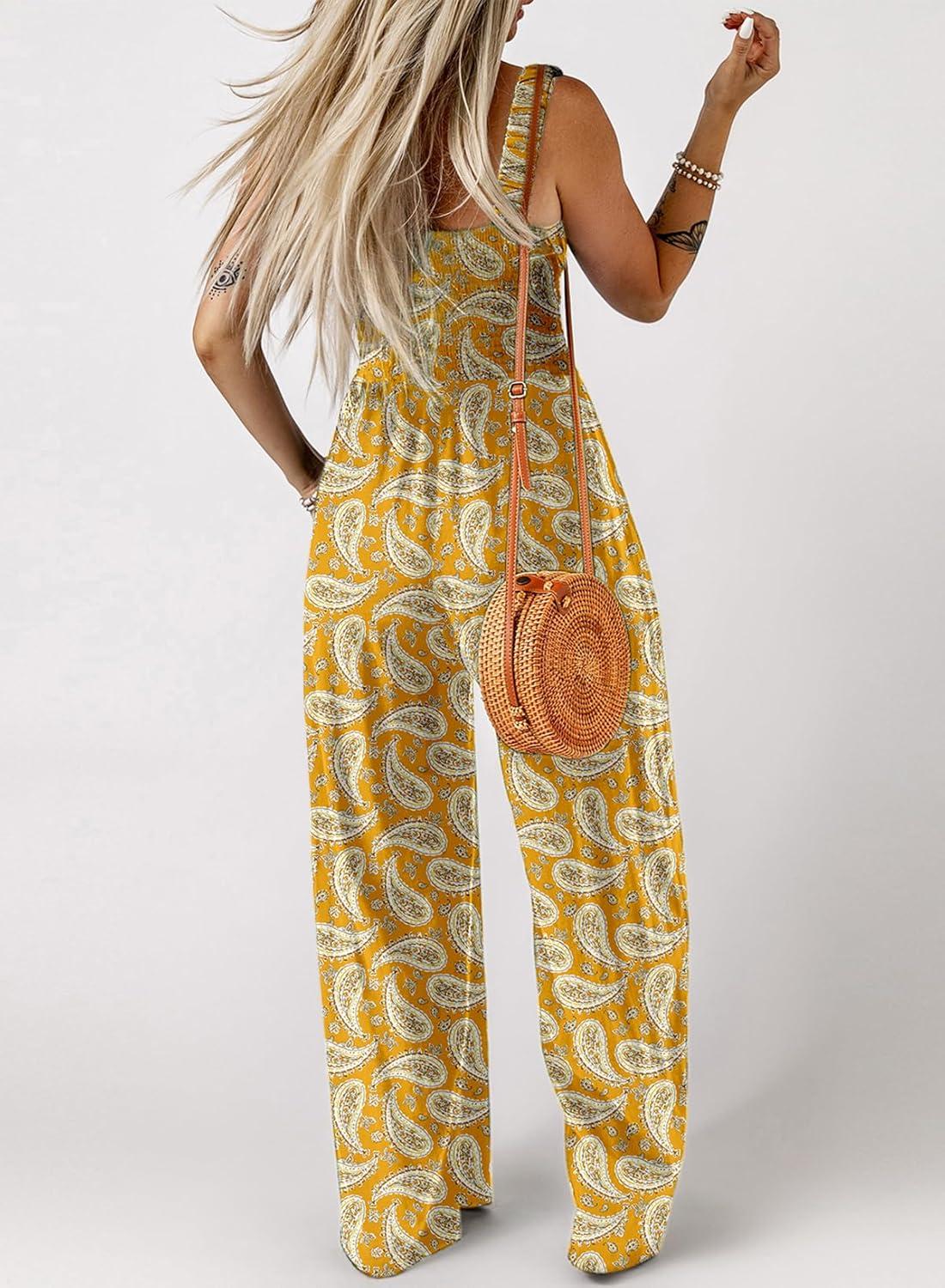 Dokotoo Women’s Casual Loose Overalls Jumpsuits One Piece Sleeveless Printed Wide Leg Long Pant Rompers With Pockets(Yellow)