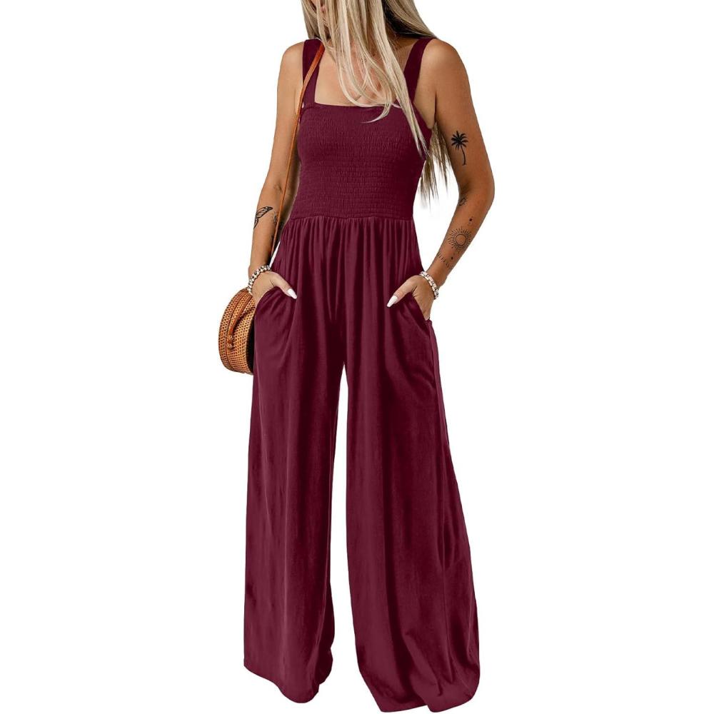 Dokotoo Women’s Casual Loose Overalls Jumpsuits One Piece Sleeveless Wide Leg Long Pant Rompers With Pockets(Burgundy)