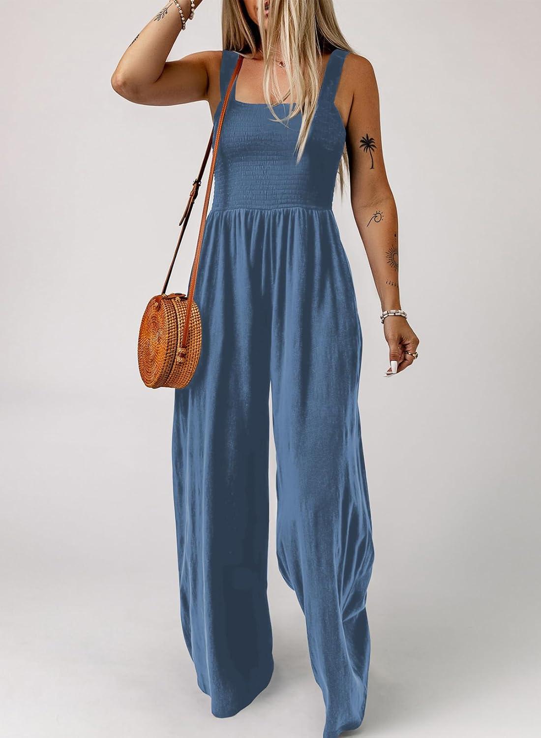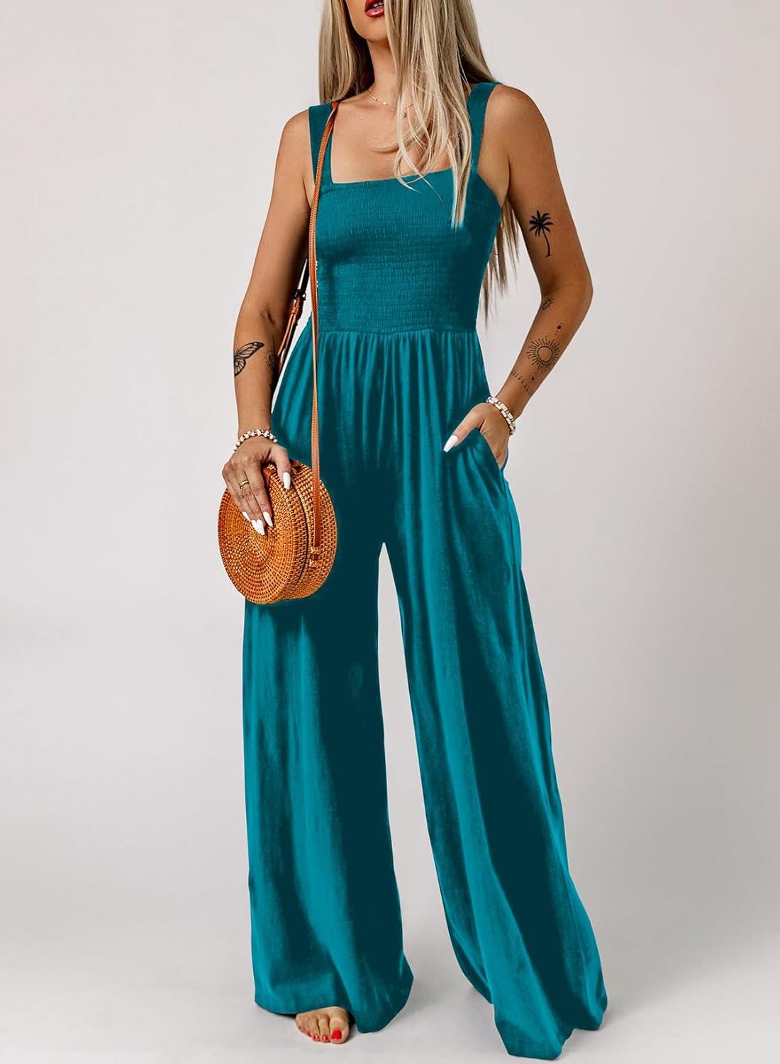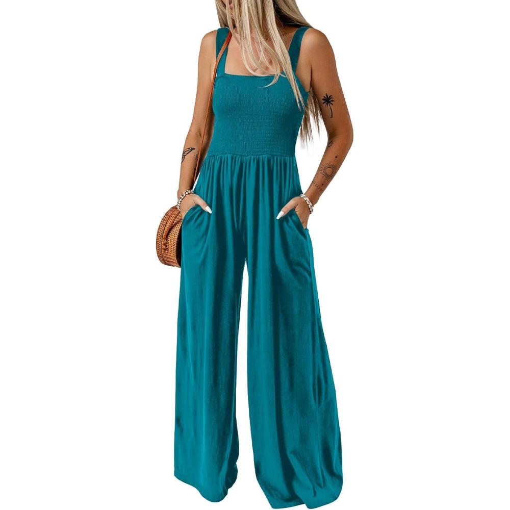 Dokotoo Women’s Casual Loose Overalls Jumpsuits One Piece Sleeveless Wide Leg Long Pant Rompers With Pockets(Peacock Blue)