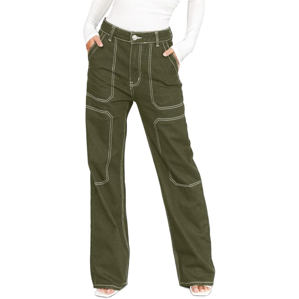 Dokotoo Women’s Casual Mid Waist Cargo Jeans Stretch Wide Leg Denim Pants with Pockets(Green)