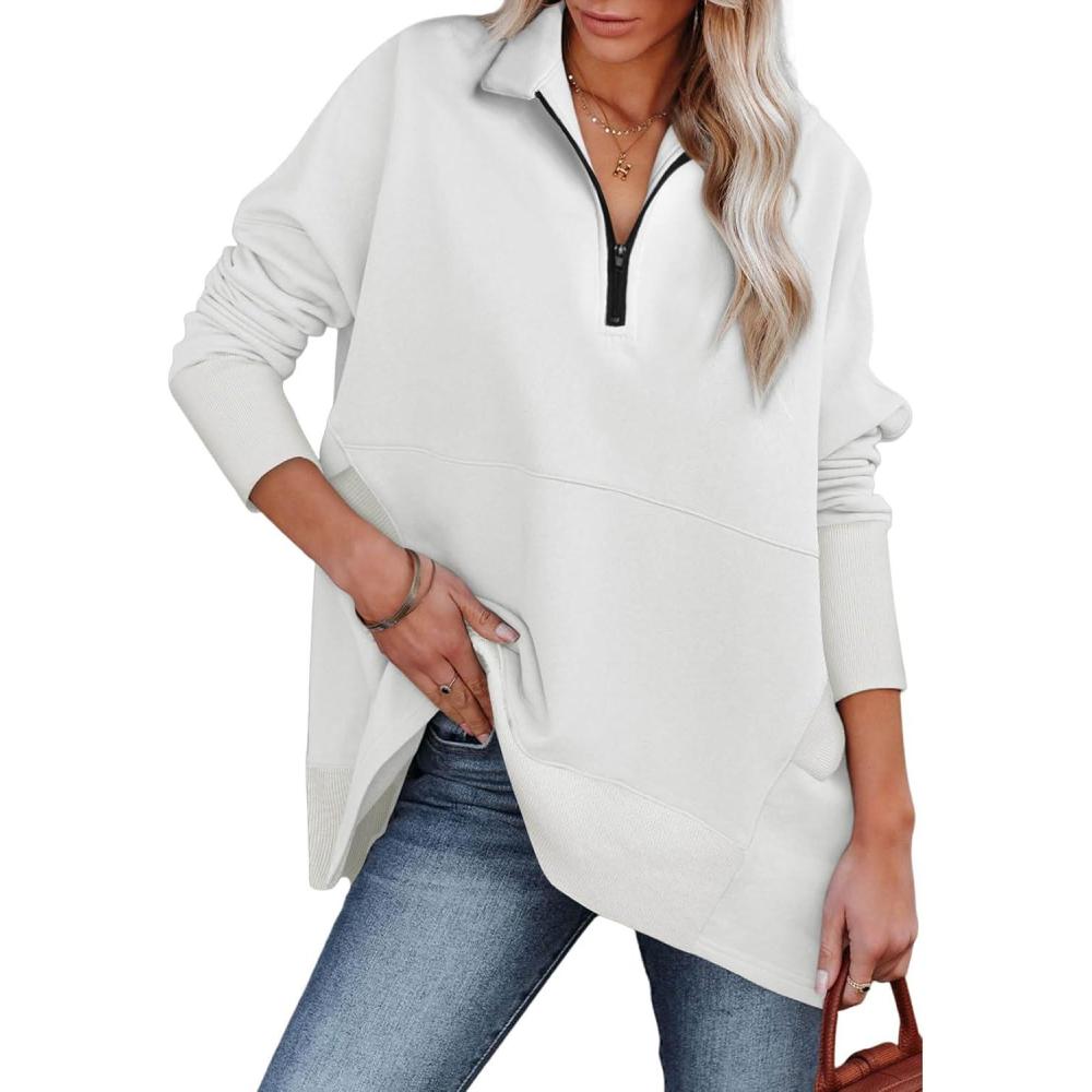 Dokotoo Women’s Casual Oversized Half Zip Sweatshirts Long Sleeve Solid Color Pullover Jackets with Pockets(White)