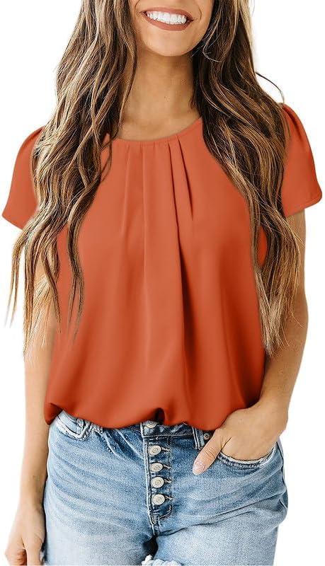 Dokotoo Women’s Casual Round Neck Basic Pleated Tops Short Sleeve Loose Fit Curved Back Chiffon Blouses Tshirts(Gold Flame)