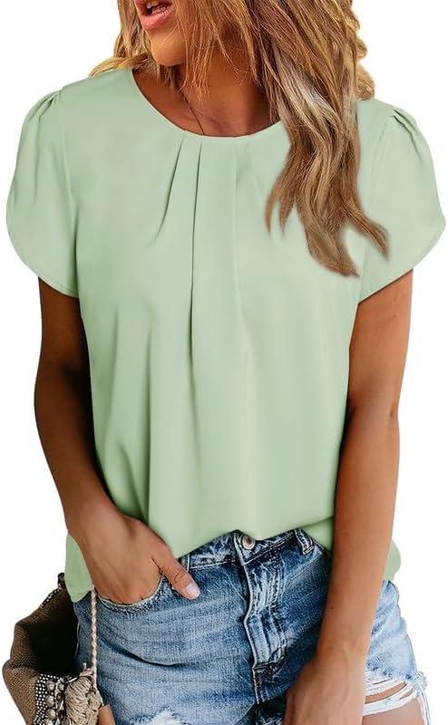 Dokotoo Women’s Casual Round Neck Basic Pleated Tops Short Sleeve Loose Fit Curved Back Chiffon Blouses Tshirts(Meadow Mist Green)