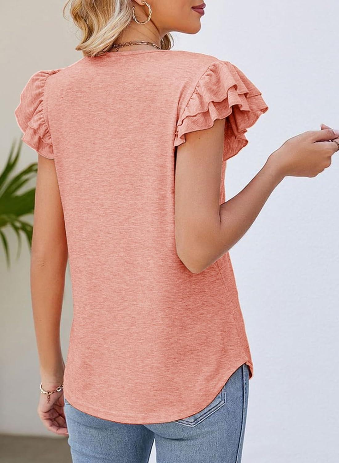 Dokotoo Women’s Casual Ruffle Short Sleeve Tops Cute Solid Color Knit Ribbed T Shirts Blouses(Peach Blossom)