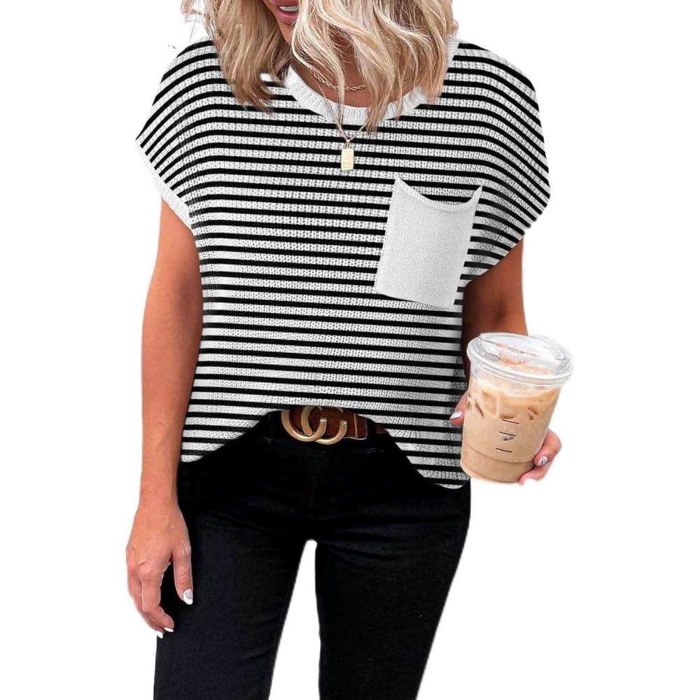 Dokotoo Women’s Casual Short Sleeve Loose Tunic Tops Lightweight Knit Spring Pullover Sweater Blouses(Black Stripe)