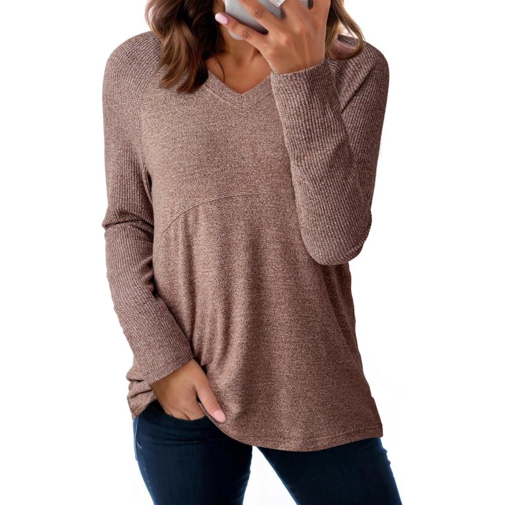 Dokotoo Women’s Casual T Shirts Long Sleeve V Neck Ribbed Knit Tops Tee Shirts(Chestnut)