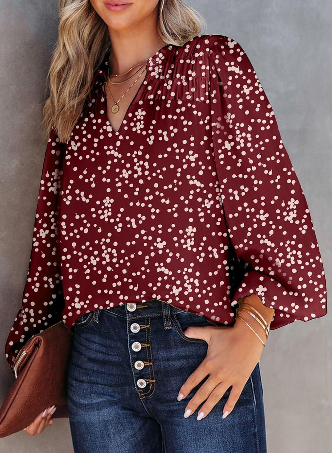 Dokotoo Women’s Casual V Neck Alicia Floral Print Smocked Long Sleeve Chiffon Blouses Bohemian Top Shirts(Biking Red)