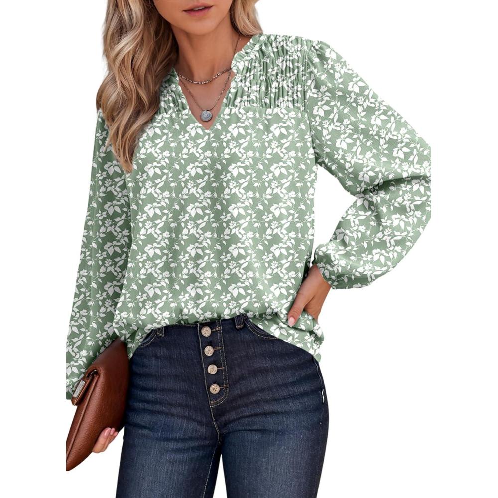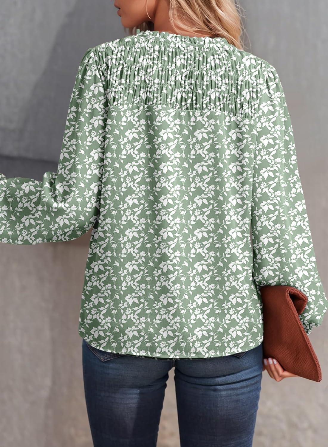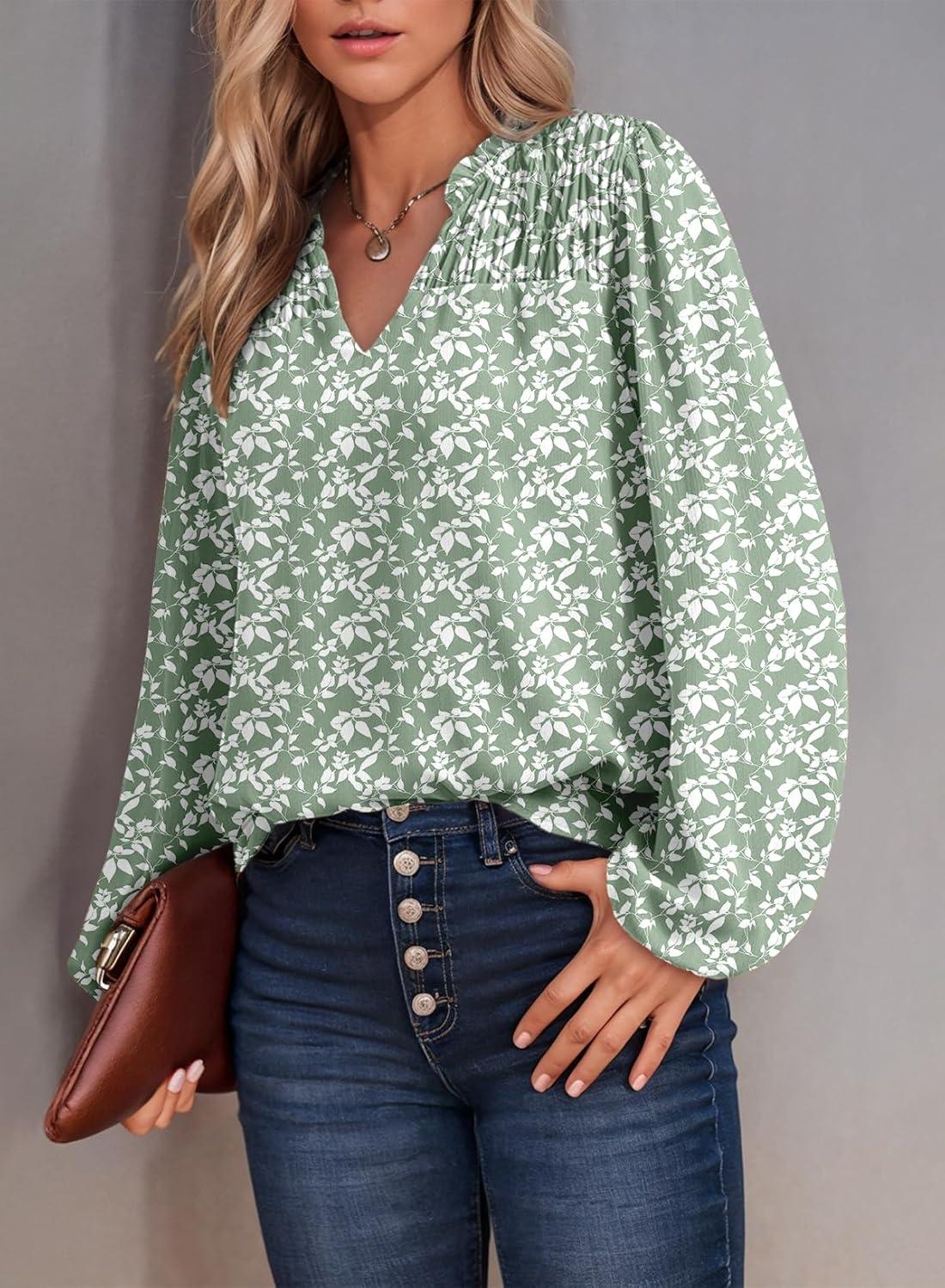 Dokotoo Women’s Casual V Neck Alicia Floral Print Smocked Long Sleeve Chiffon Blouses Bohemian Top Shirts(Dark Green)