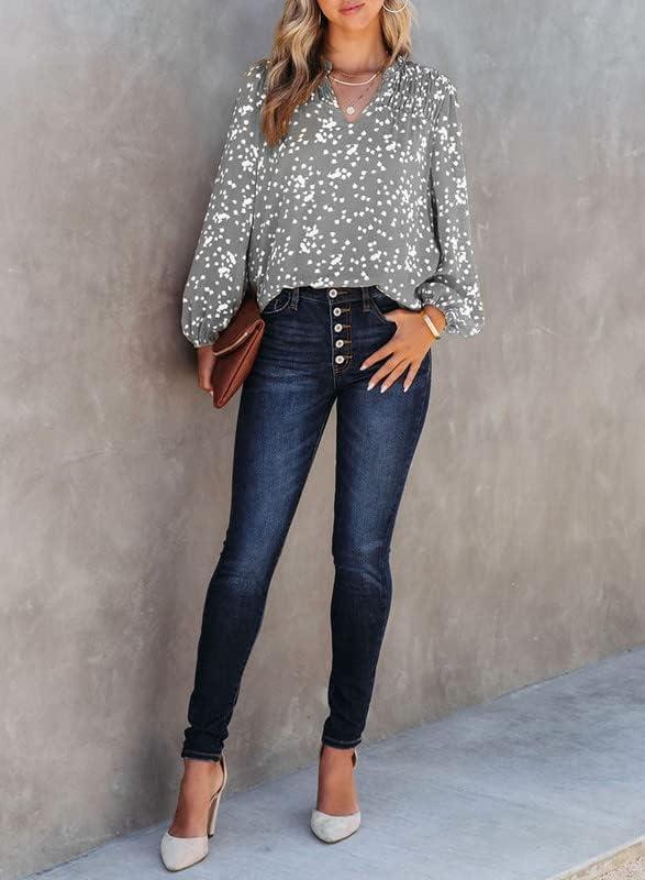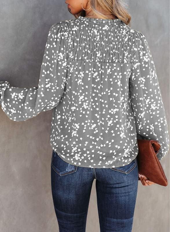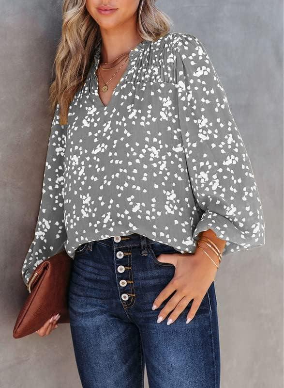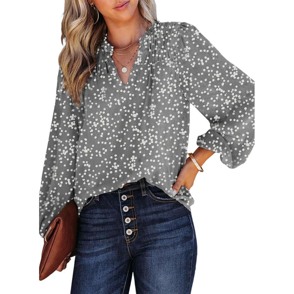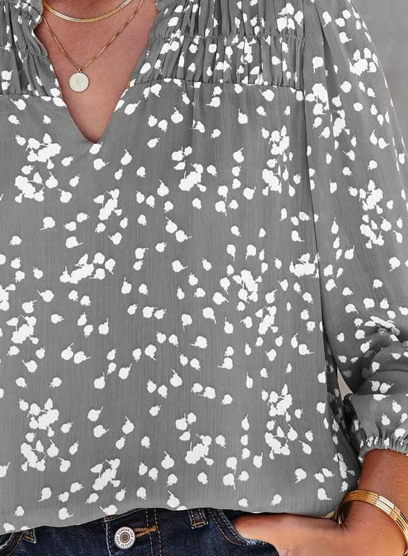 Dokotoo Women’s Casual V Neck Alicia Floral Print Smocked Long Sleeve Chiffon Blouses Bohemian Top Shirts(Gray)