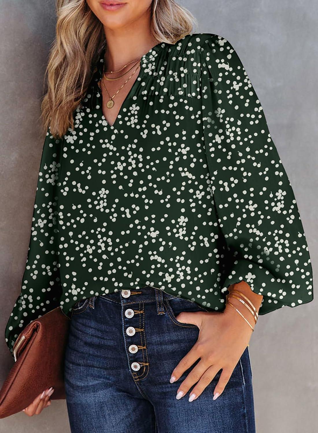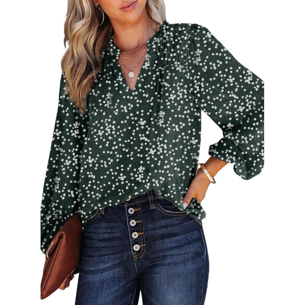 Dokotoo Women’s Casual V Neck Alicia Floral Print Smocked Long Sleeve Chiffon Blouses Bohemian Top Shirts(Green)