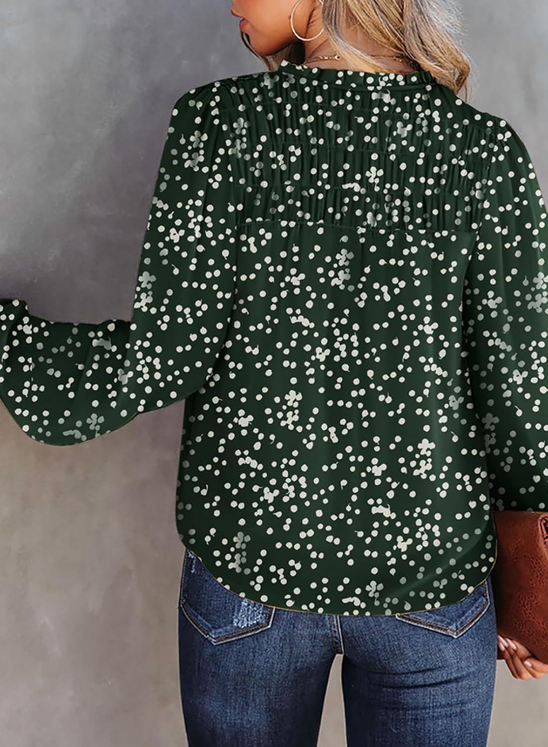 Dokotoo Women’s Casual V Neck Alicia Floral Print Smocked Long Sleeve Chiffon Blouses Bohemian Top Shirts(Grass Green)