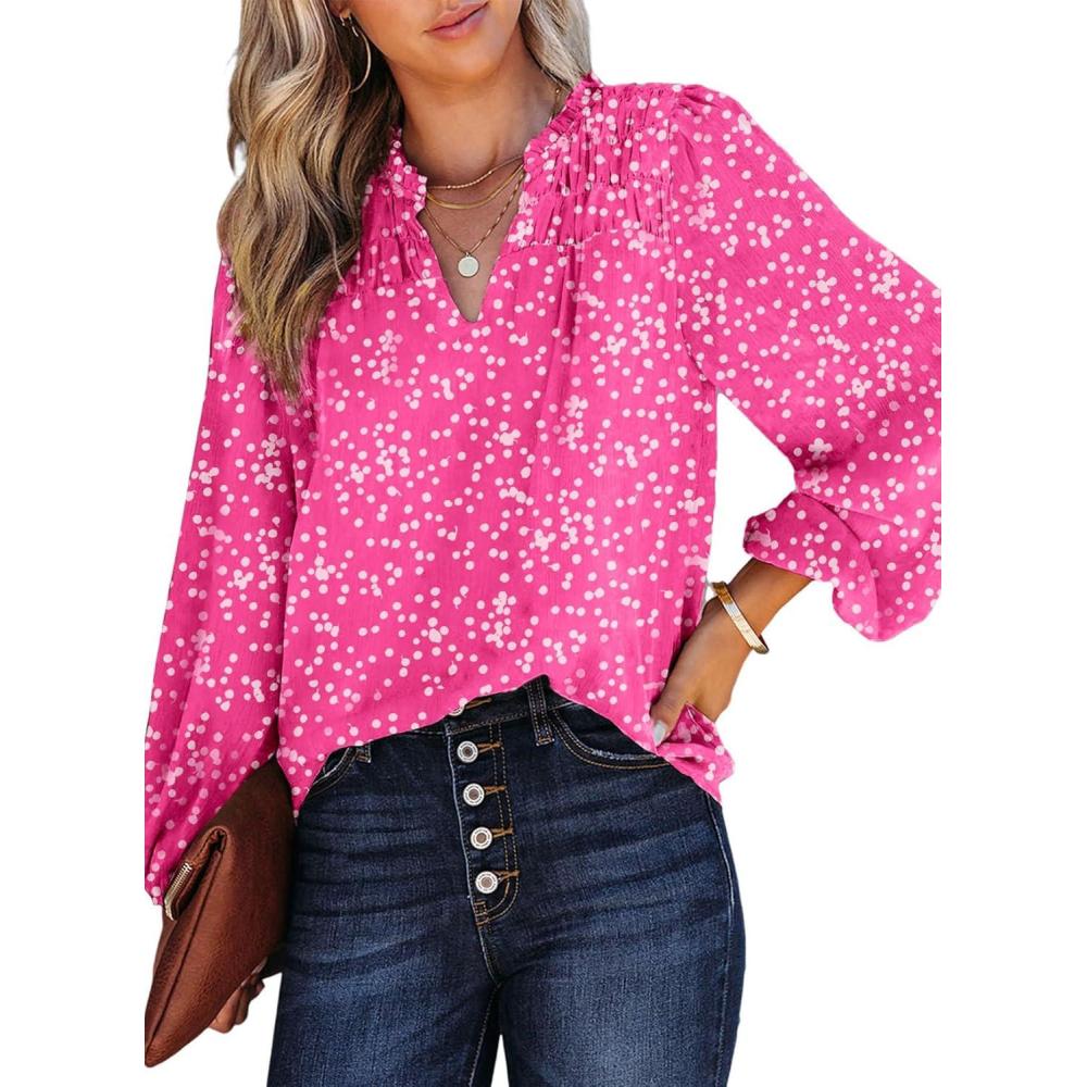 Dokotoo Women’s Casual V Neck Alicia Floral Print Smocked Long Sleeve Chiffon Blouses Bohemian Top Shirts(Pink)