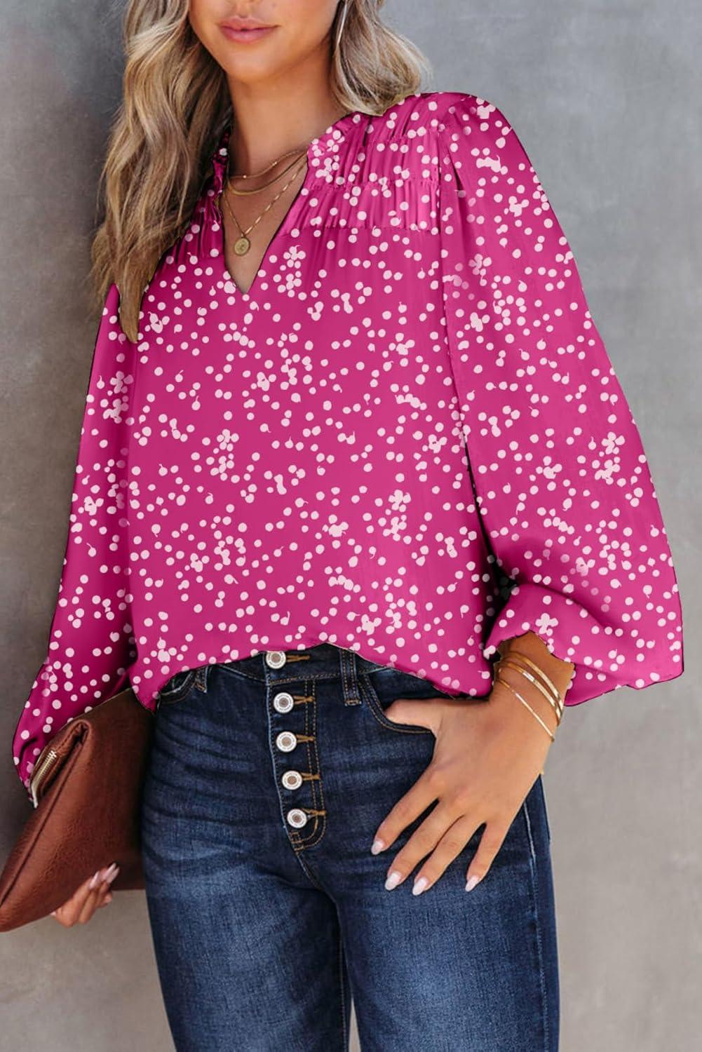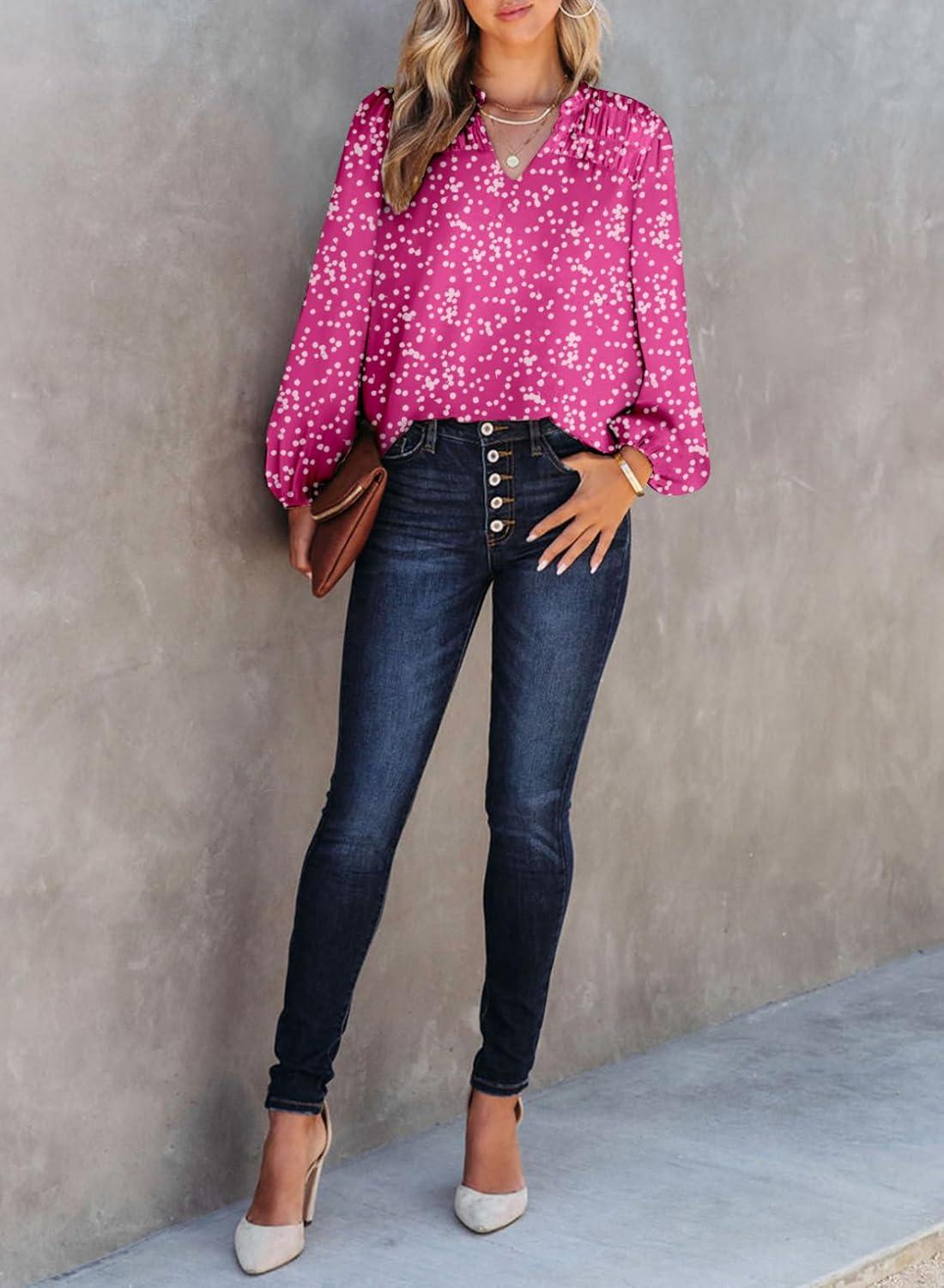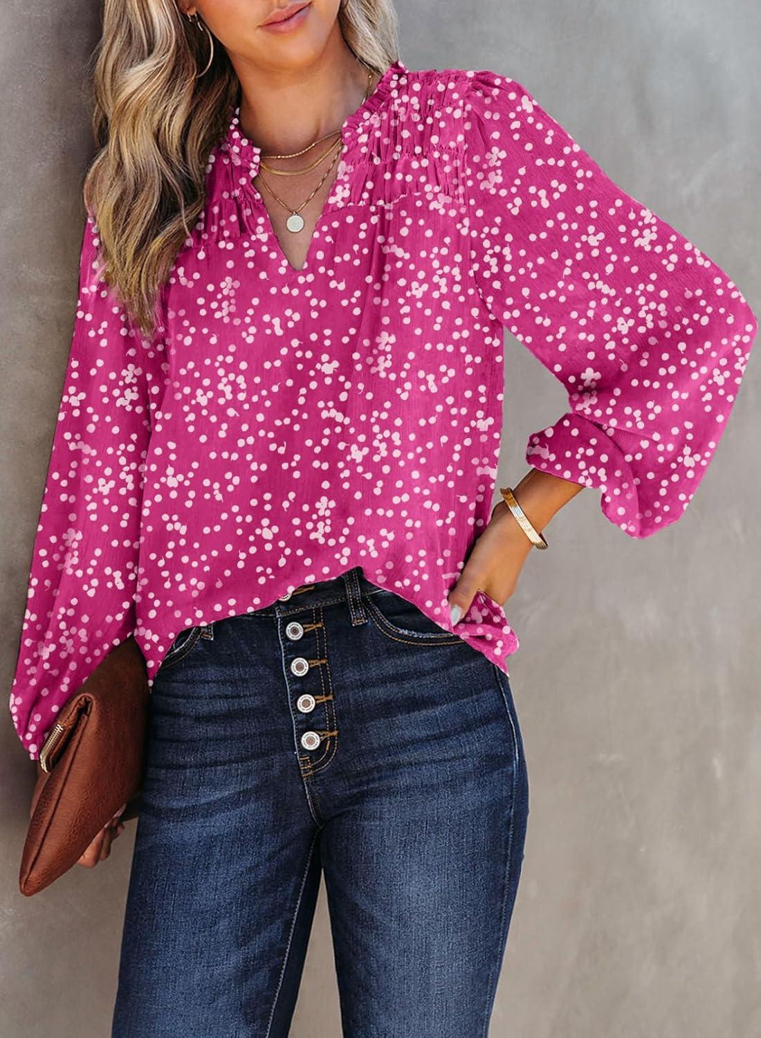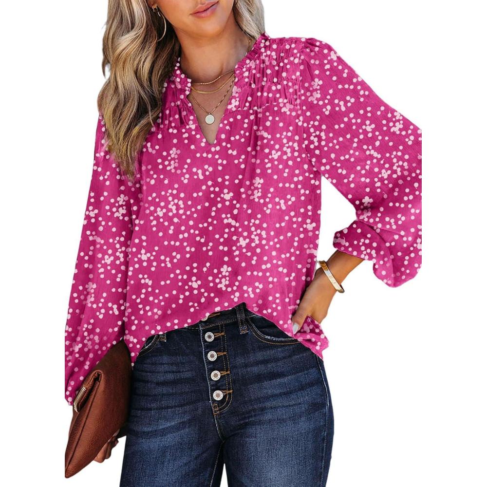 Dokotoo Women’s Casual V Neck Alicia Floral Print Smocked Long Sleeve Chiffon Blouses Bohemian Top Shirts(Rose Red)