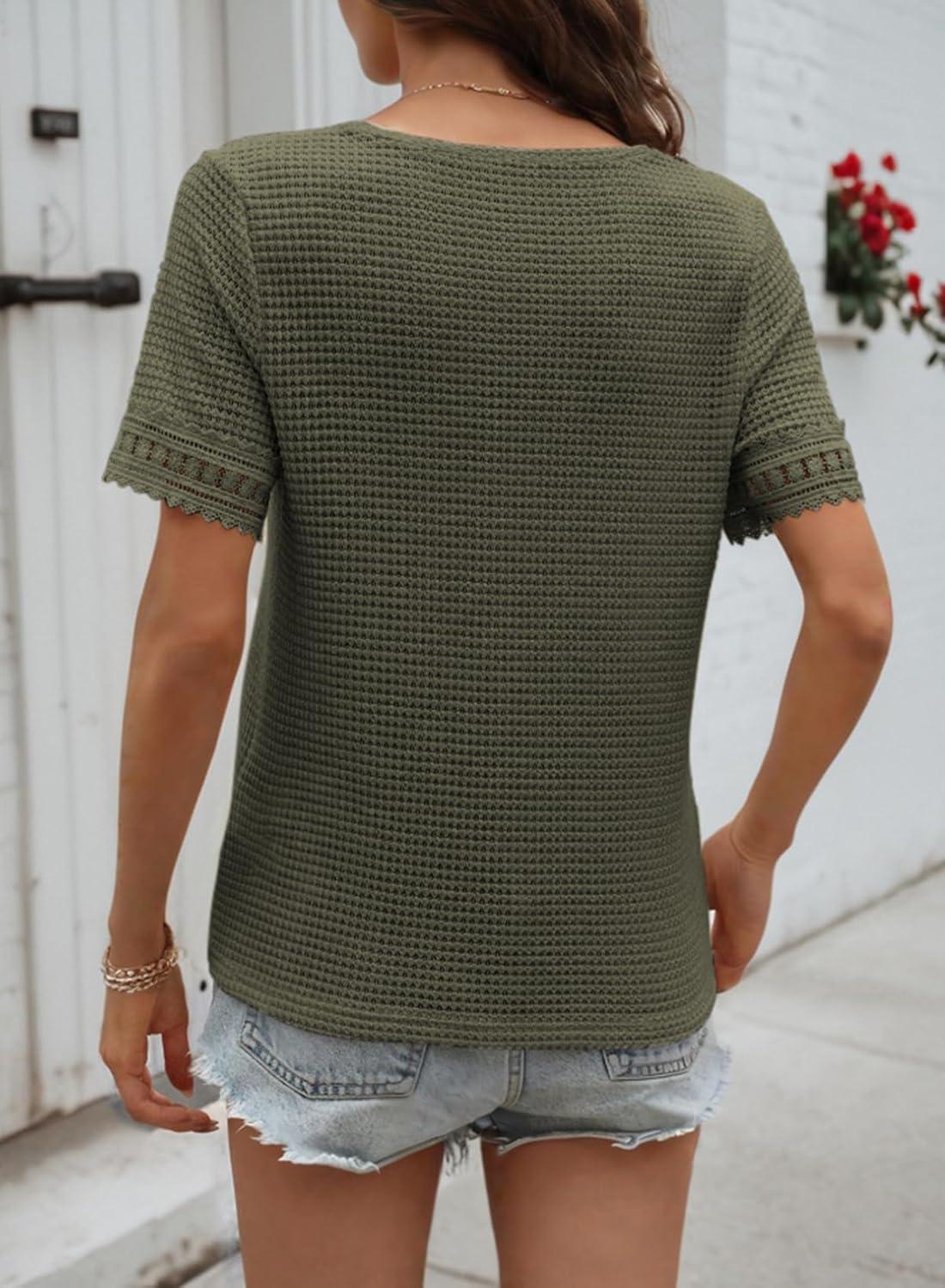 Dokotoo Women’s Casual V Neck Short Sleeve Waffle Knit Lace Patchwork Shirts Summer Loose Basic Tunic Tops Tee Blouses(Green Bay)
