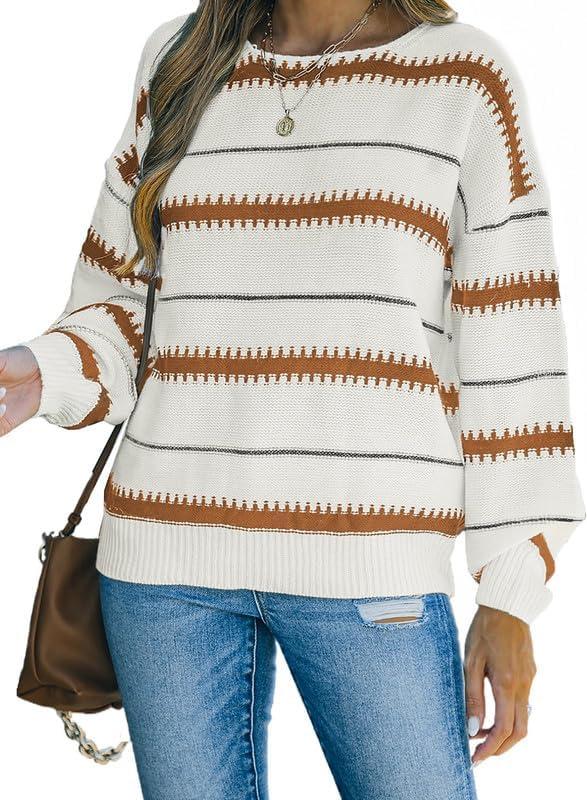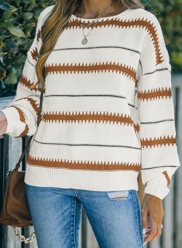 Dokotoo Womens Color Block Sweaters Long Sleeve Crewneck Pullover Knit Jumper Tops(A3 Brown)