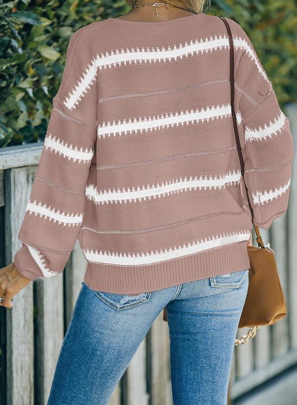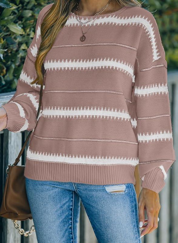 Dokotoo Womens Color Block Sweaters Long Sleeve Crewneck Pullover Knit Jumper Tops(A3 Pink)