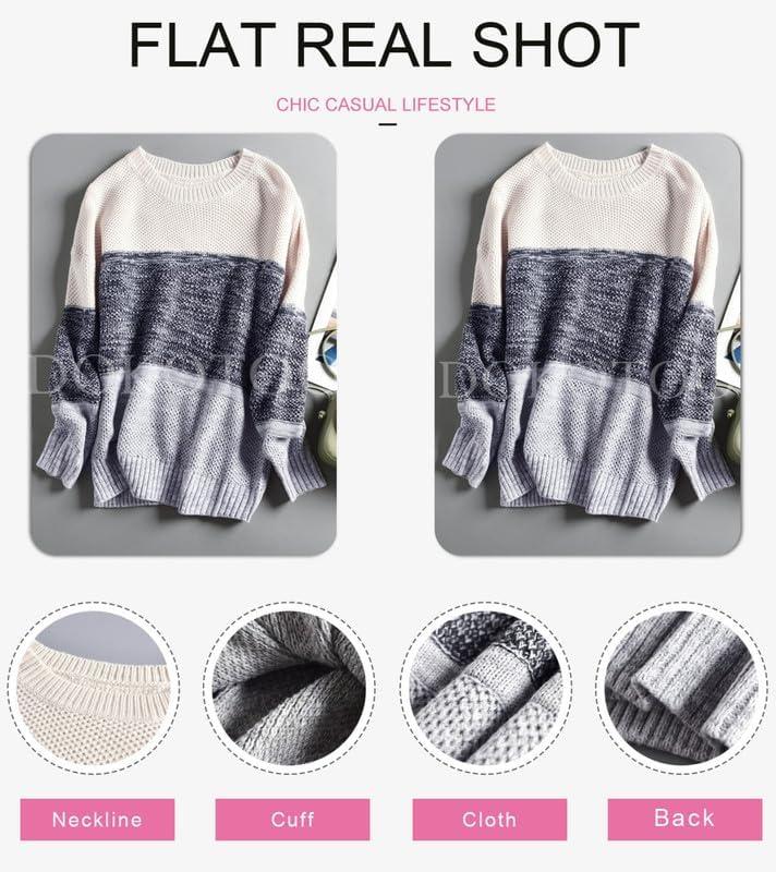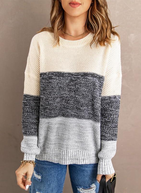 Dokotoo Womens Color Block Sweaters Long Sleeve Crewneck Pullover Knit Jumper Tops(Dd Gray)