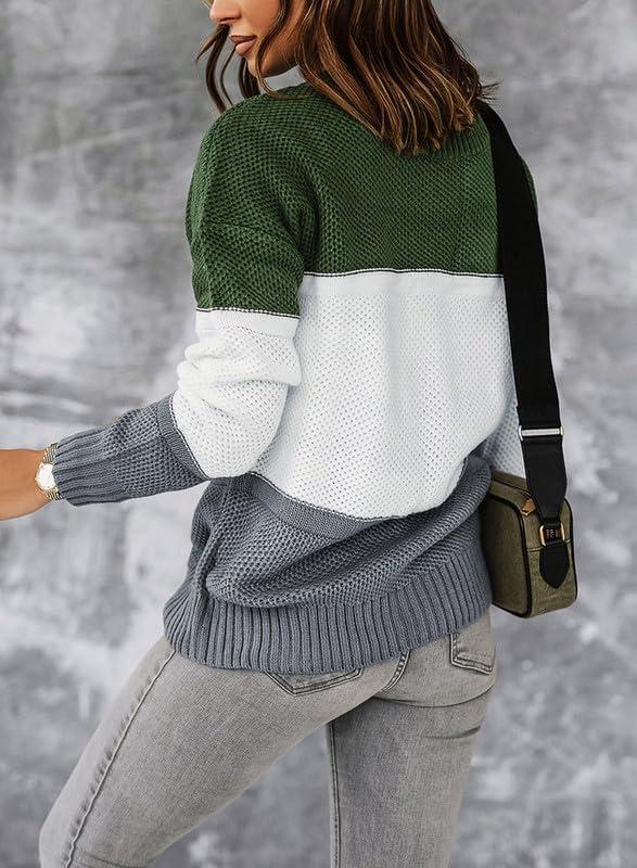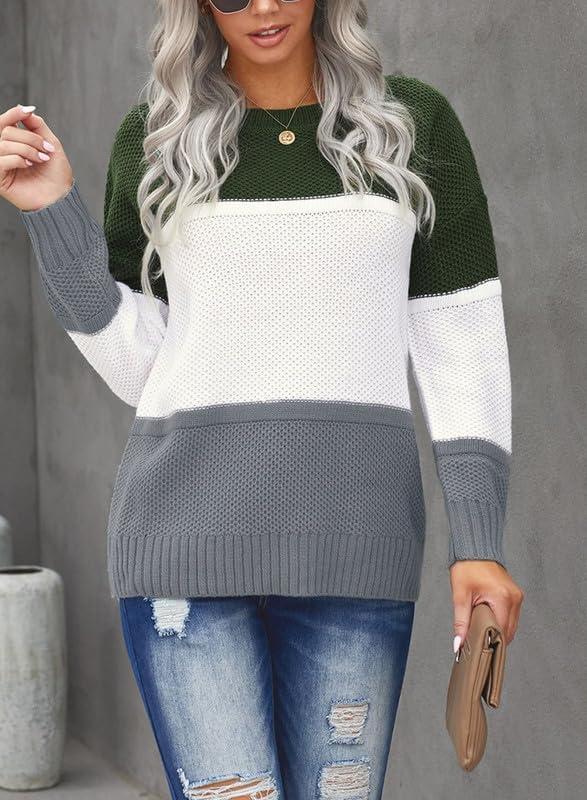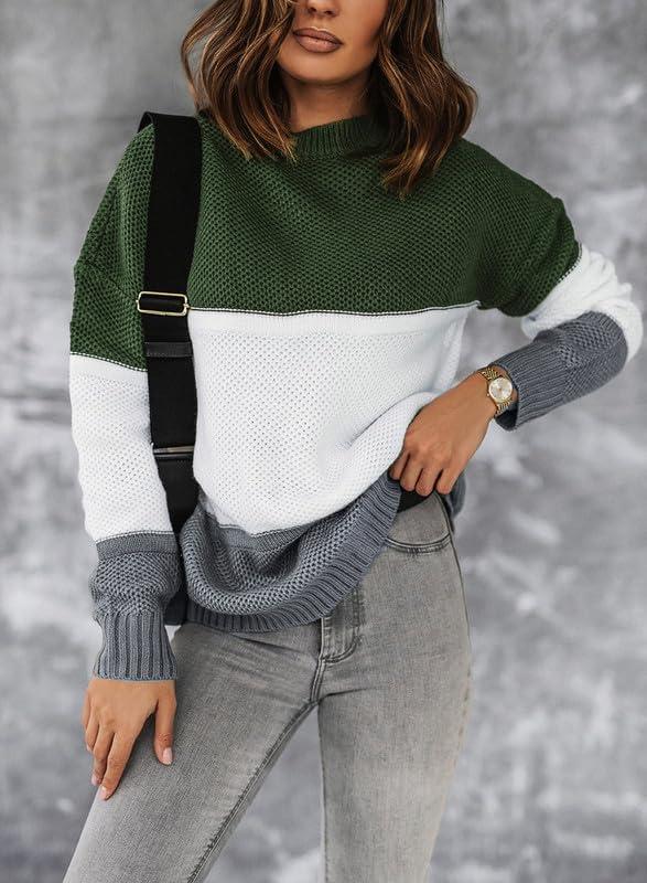 Dokotoo Womens Color Block Sweaters Long Sleeve Crewneck Pullover Knit Jumper Tops(D Green)