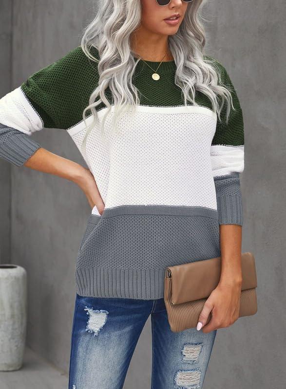 Dokotoo Womens Color Block Sweaters Long Sleeve Crewneck Pullover Knit Jumper Tops(B1 Green)