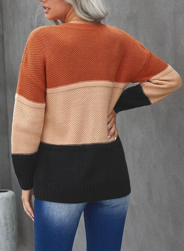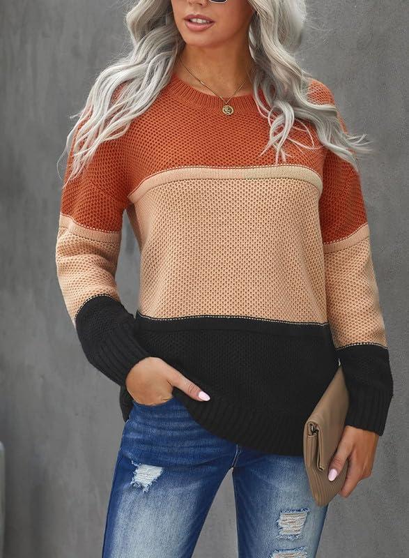 Dokotoo Womens Color Block Sweaters Long Sleeve Crewneck Pullover Knit Jumper Tops(D Orange)