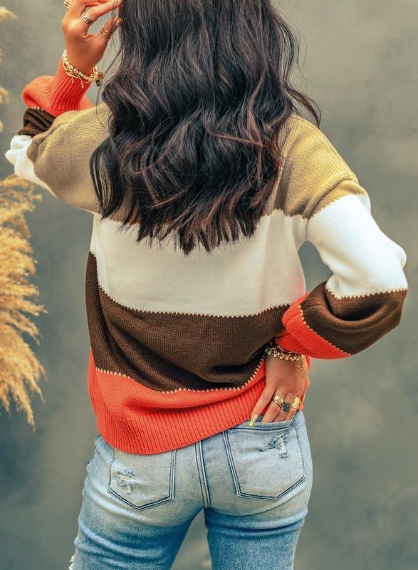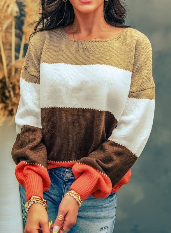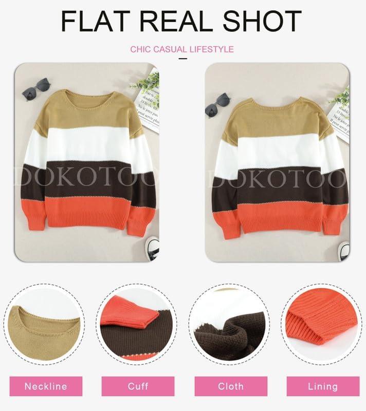 Dokotoo Womens Color Block Sweaters Long Sleeve Crewneck Pullover Knit Jumper Tops(F Brown)