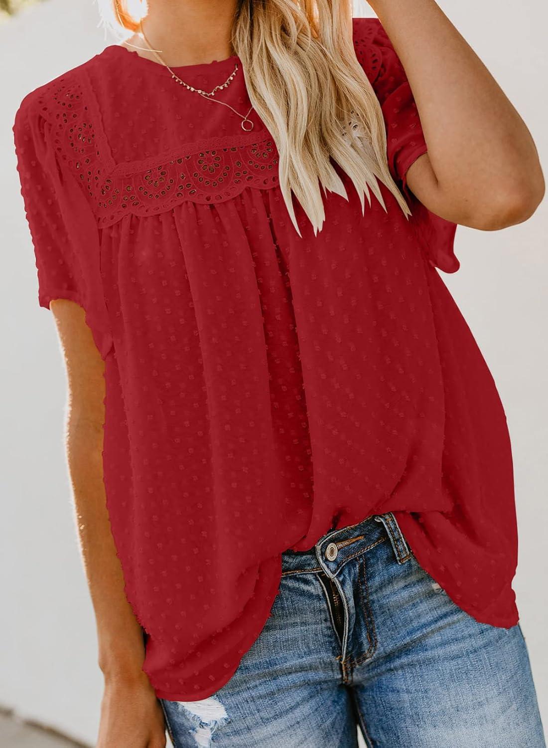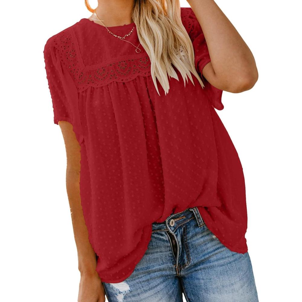 Dokotoo Womens Crewneck Lace Crochet Pom Pom Flowy Short Sleeve Casual Shirts Blouses Tops(A Red)