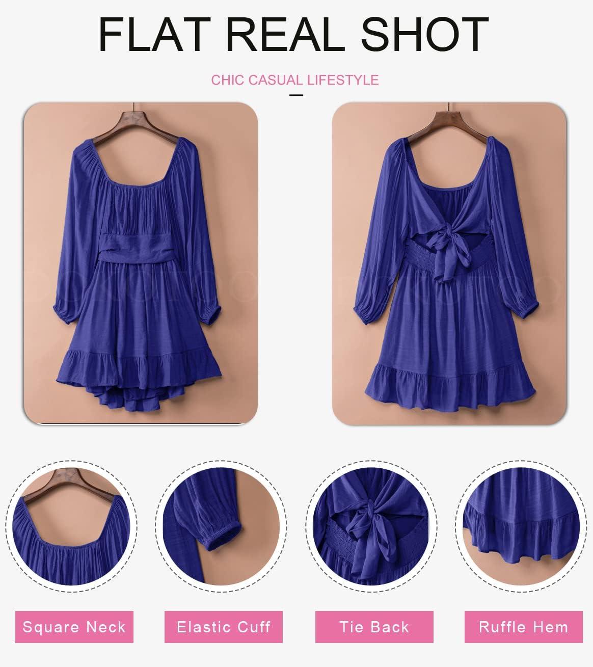 Dokotoo Womens Dress Long Lantern Sleeve Square Neck Tie Backless Sexy Dress Ruffle Elastic Waist A-Line Mini Dress(Blue)