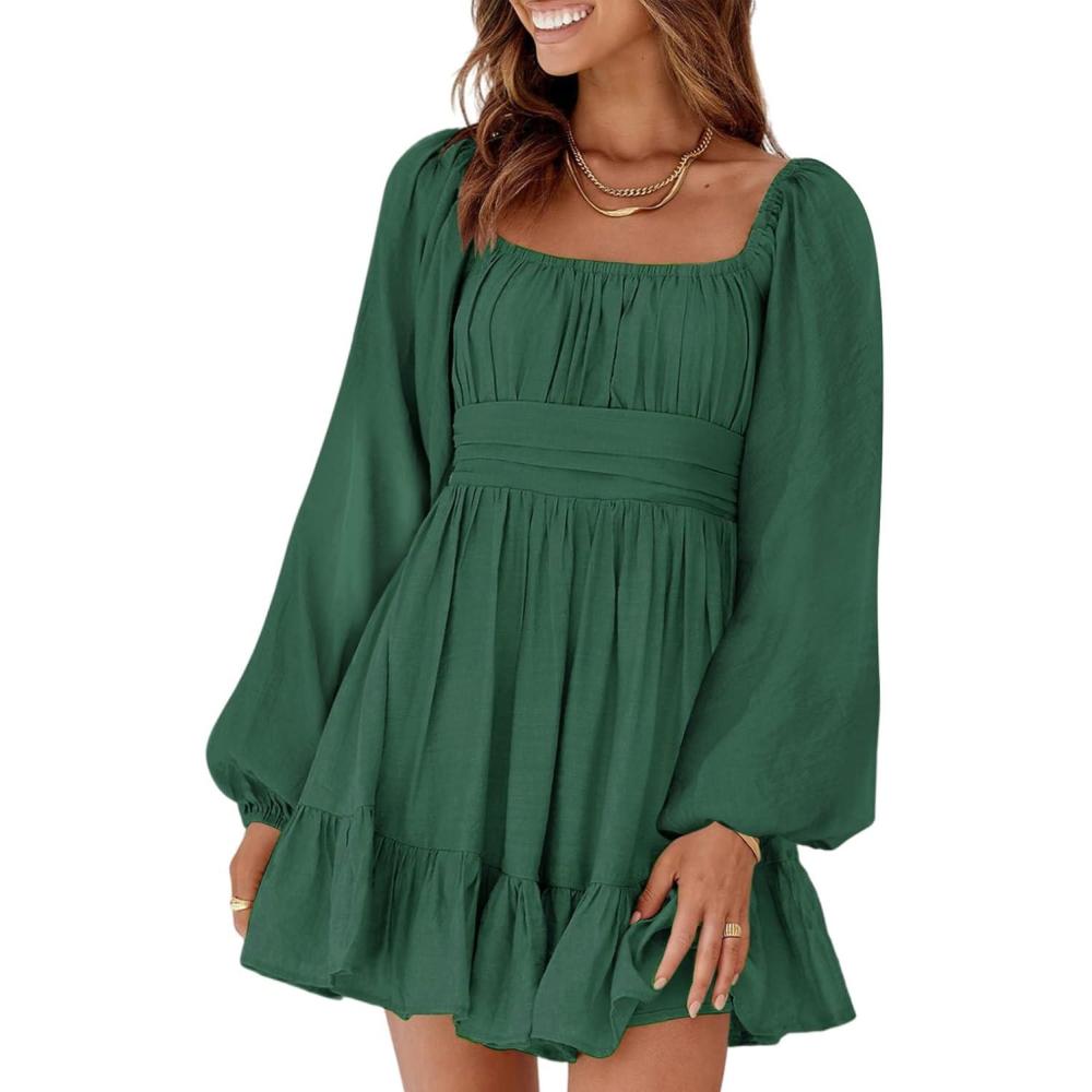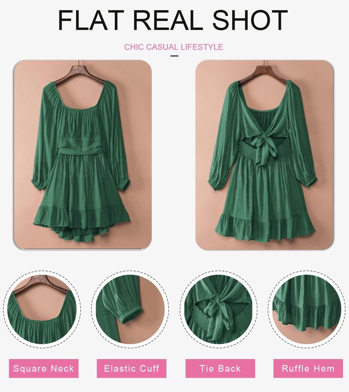 Dokotoo Womens Dress Long Lantern Sleeve Square Neck Tie Backless Sexy Dress Ruffle Elastic Waist A-Line Mini Dress(Dark Green)