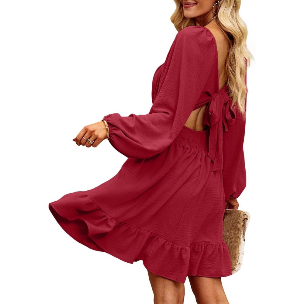 Dokotoo Womens Dress Long Lantern Sleeve Square Neck Tie Backless Sexy Dress Ruffle Elastic Waist A-Line Mini Dress(Red)