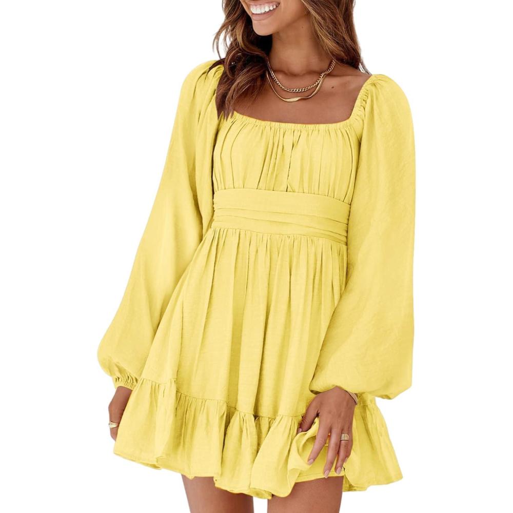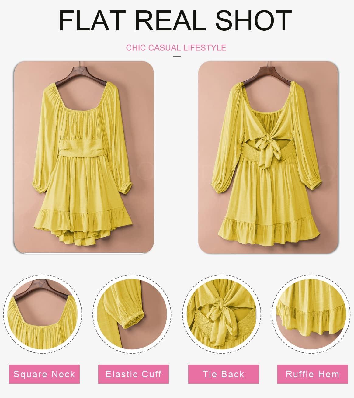 Dokotoo Womens Dress Long Lantern Sleeve Square Neck Tie Backless Sexy Dress Ruffle Elastic Waist A-Line Mini Dress(Yellow)