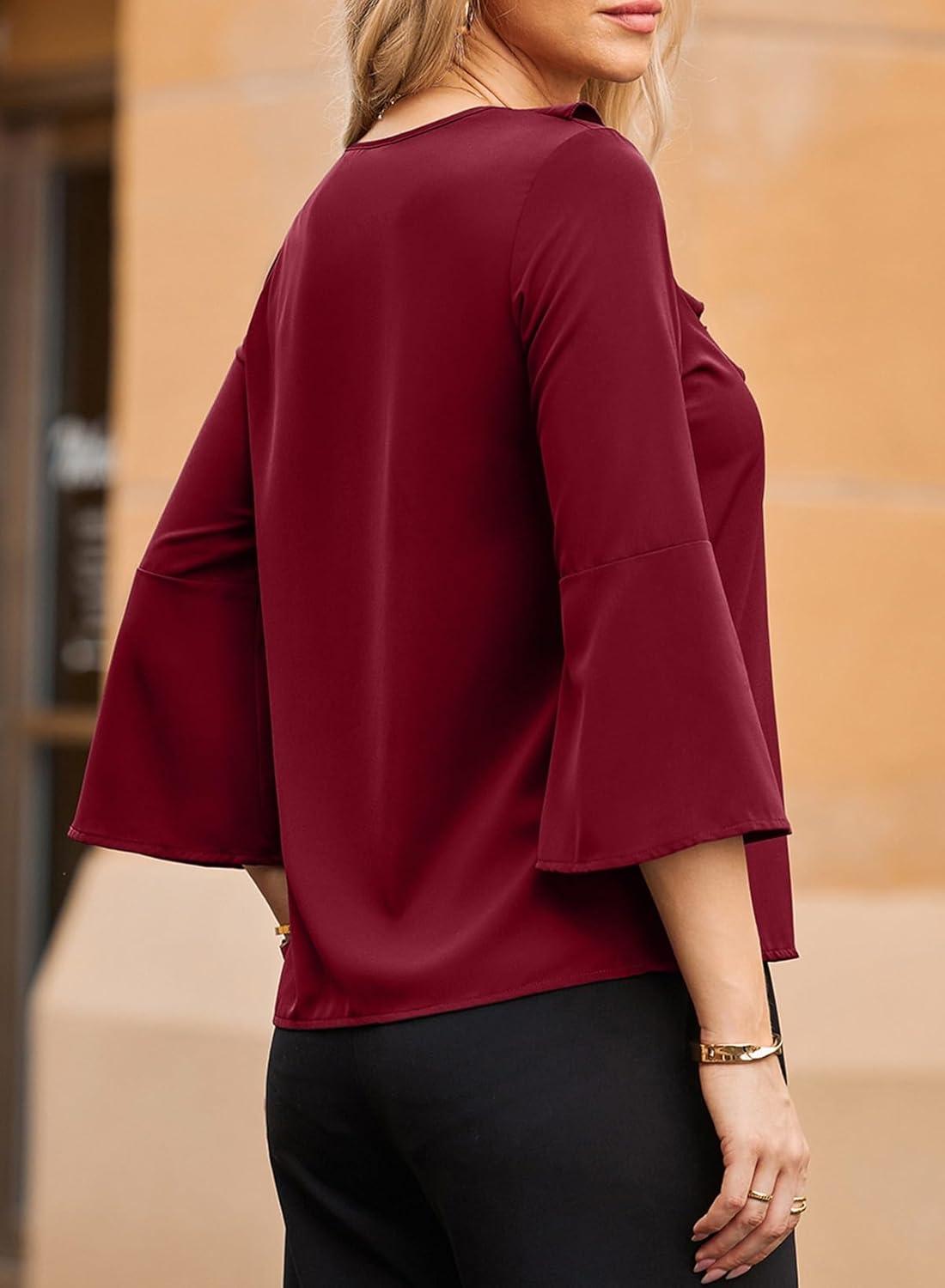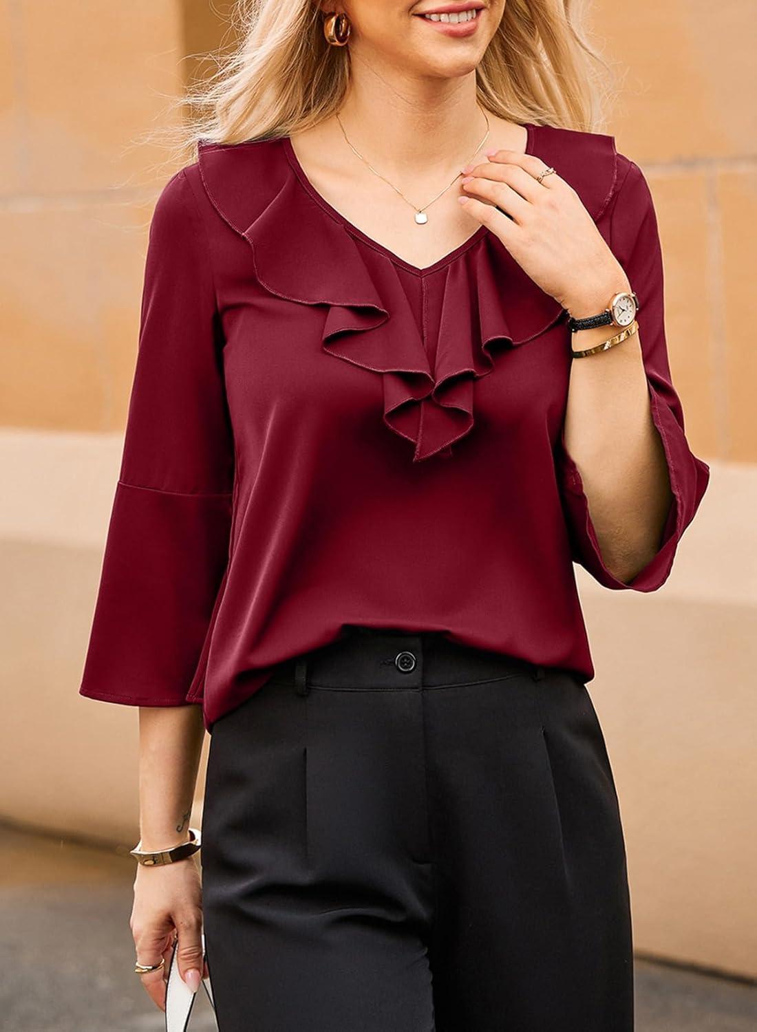 Dokotoo Womens Dressy Casual Blouses 3/4 Sleeve Fall Tops 2025 Ruffle V Neck Business Shirts(Red)