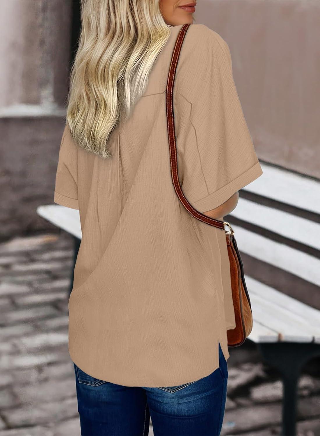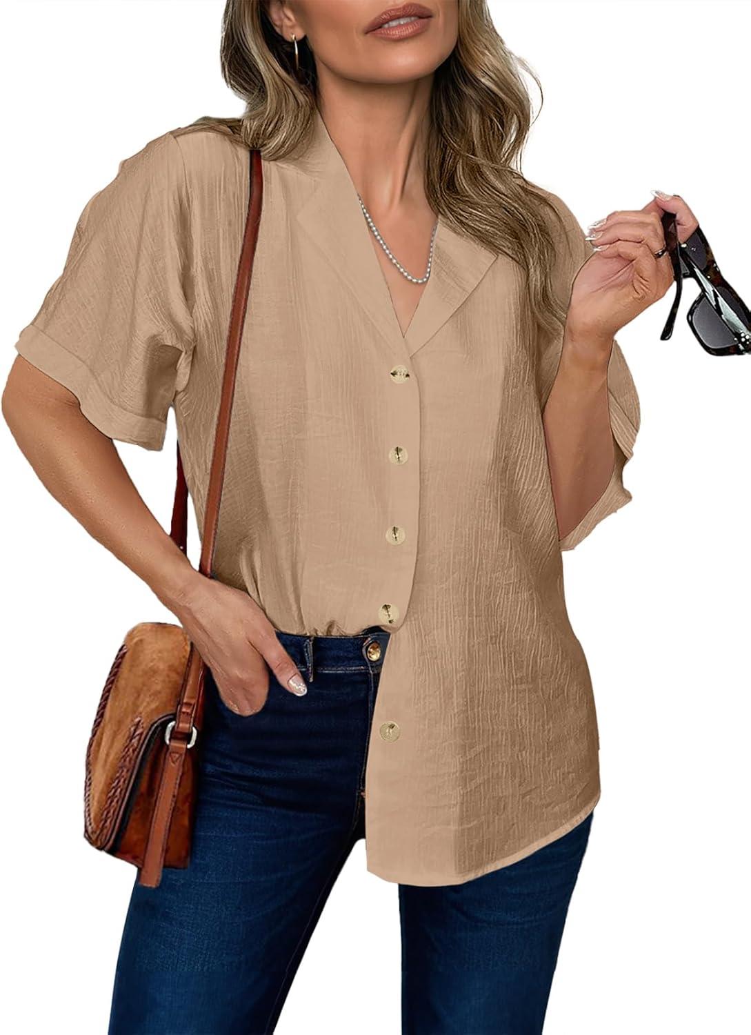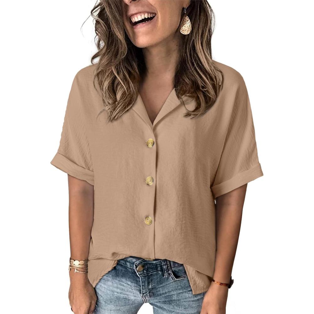 Dokotoo Women’s Dressy Casual V Neck Short Sleeve Button Down Shirts Relaxed Work Business Loose Blouses Tops(Khaki)