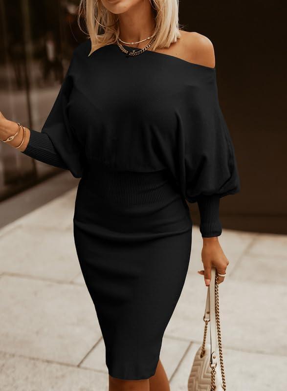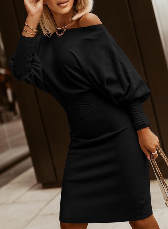 Dokotoo Women’s Elegant Off Shoulder Long Lantern Sleeve Sweater Dress Elastic Waist Bodycon Mini Dresses(Black)