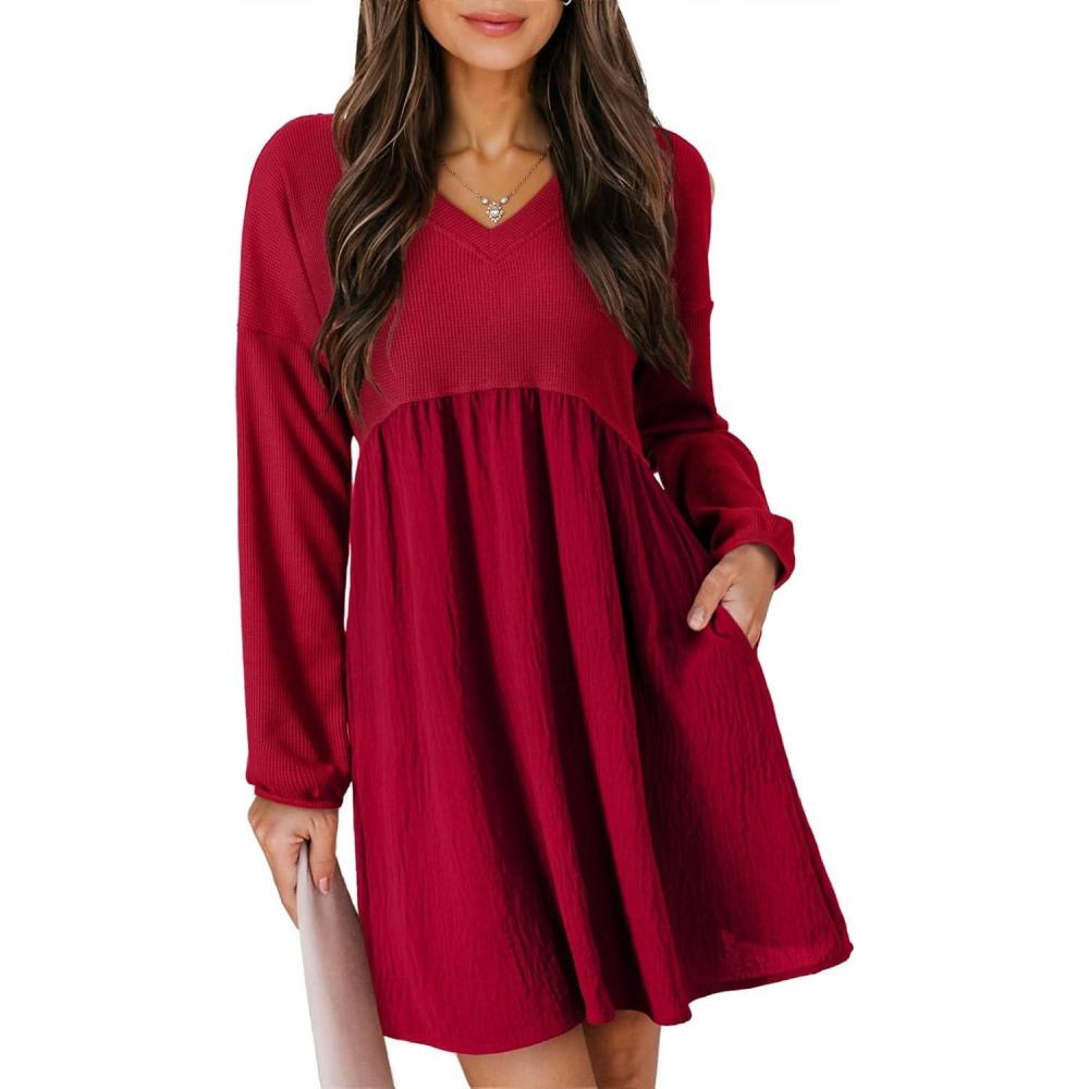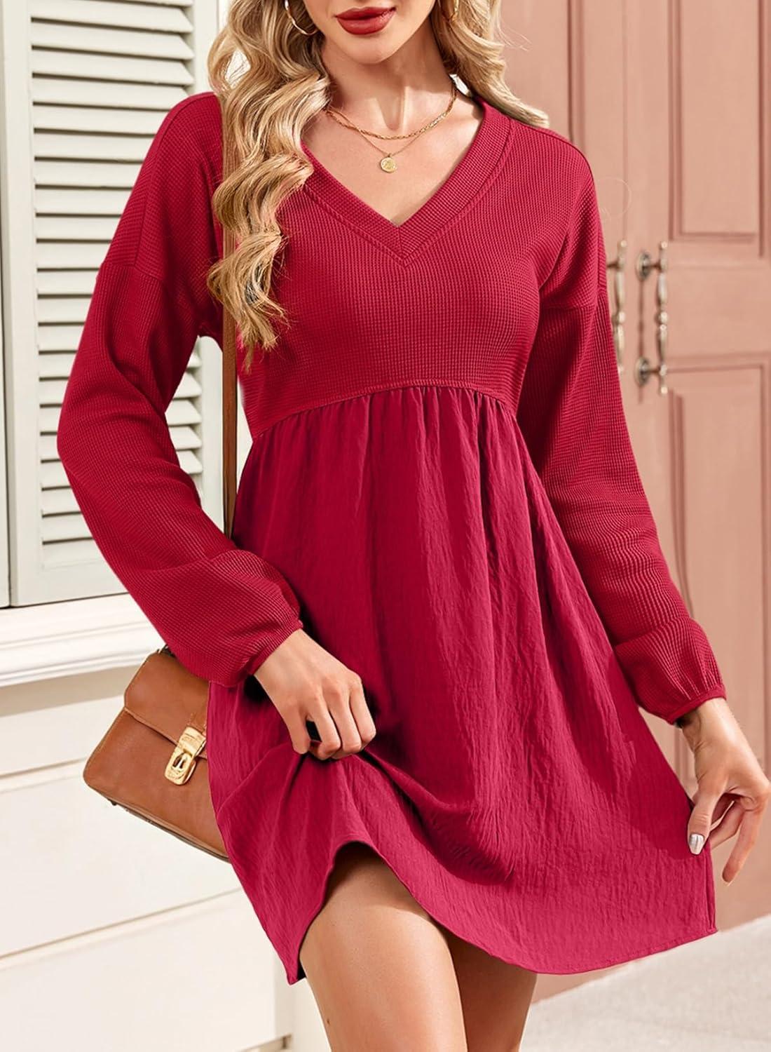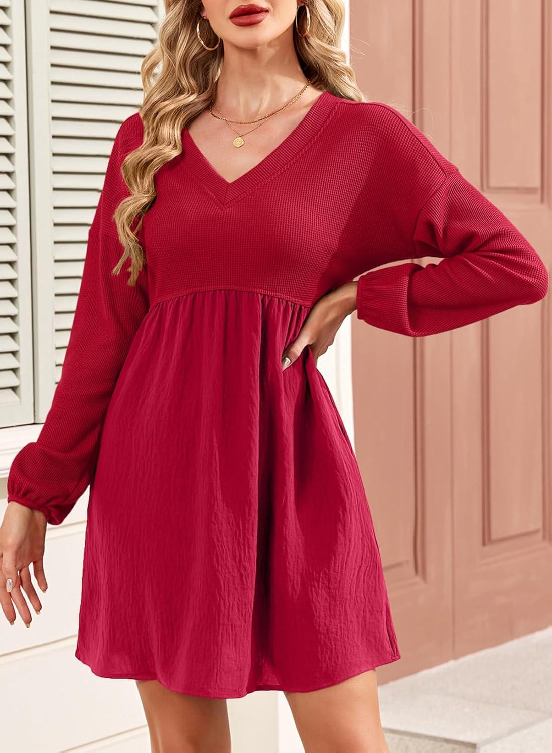 Dokotoo Womens Fall Dresses 2025 Casual V-Neck Long Sleeve Empire Waist Waffle Knit Mini Dress with Pockets(Red)