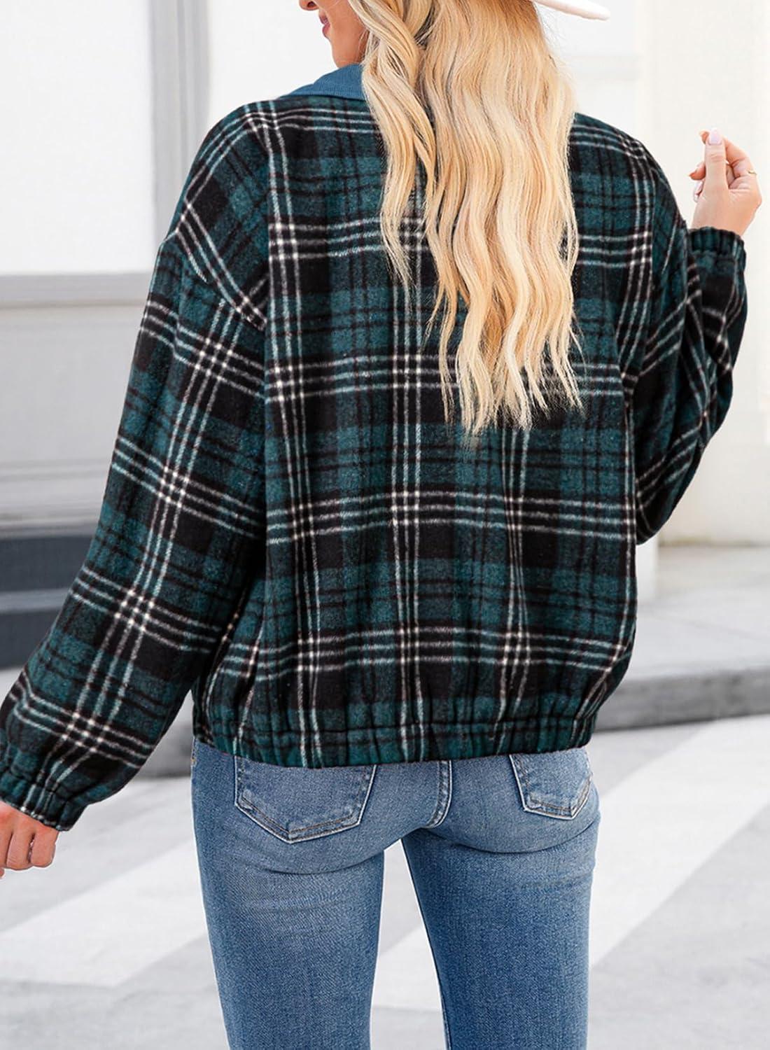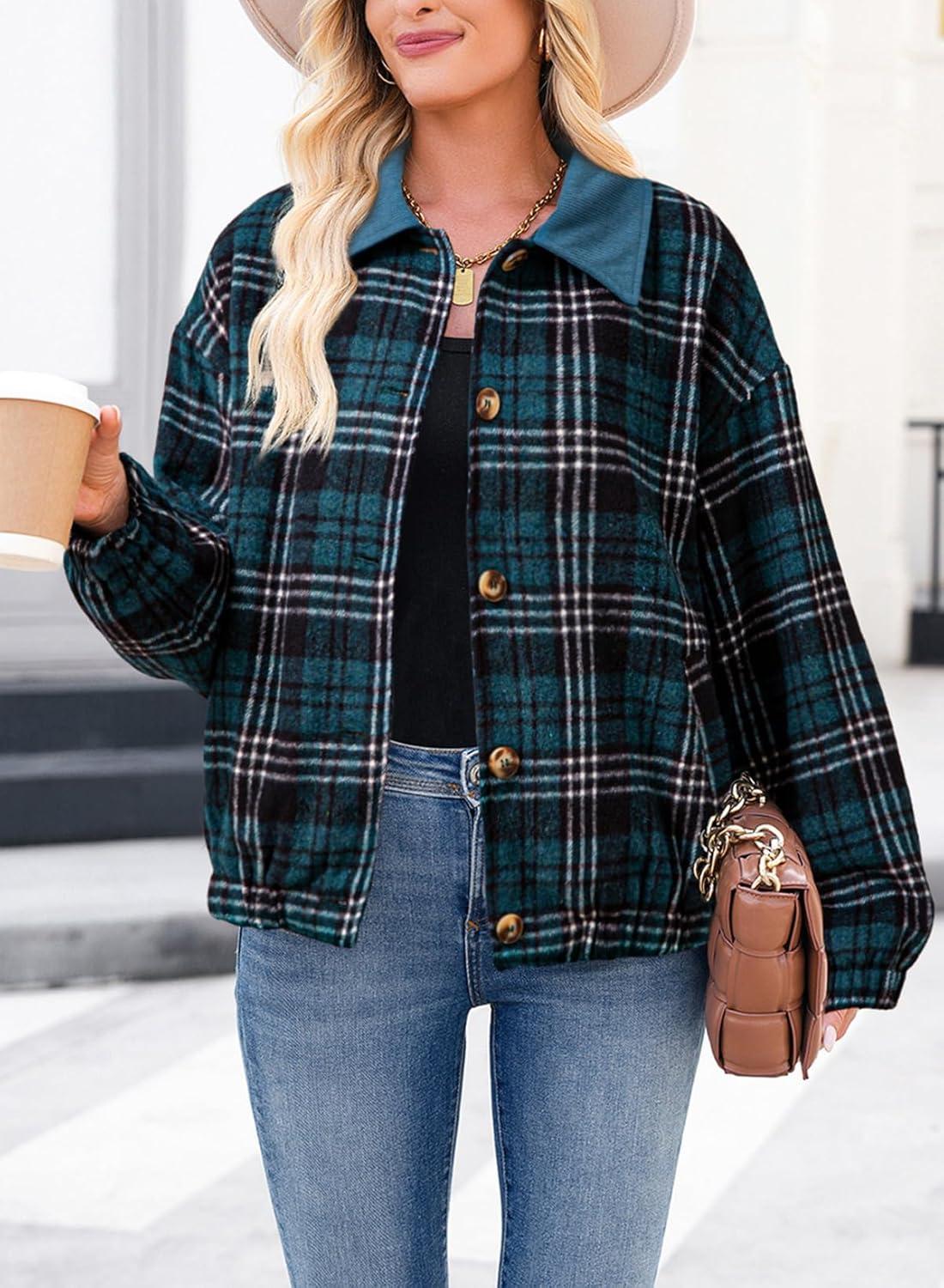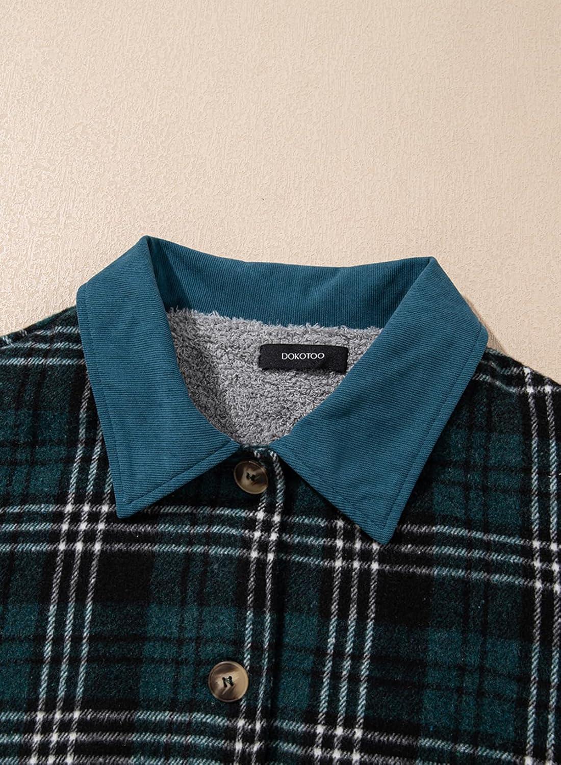 Dokotoo Womens Flannel Plaid Shacket Jackets Corduroy Collar Long Sleeve Button Down Fleece Jackets Warm Coat(Sea Green)