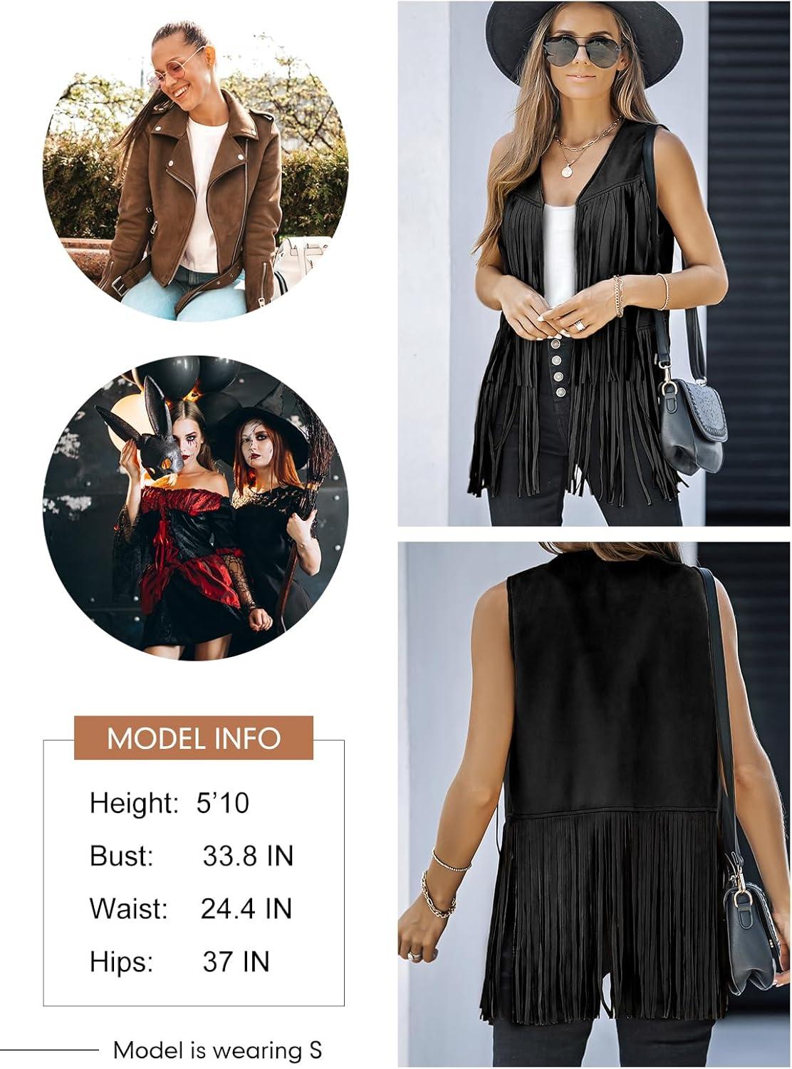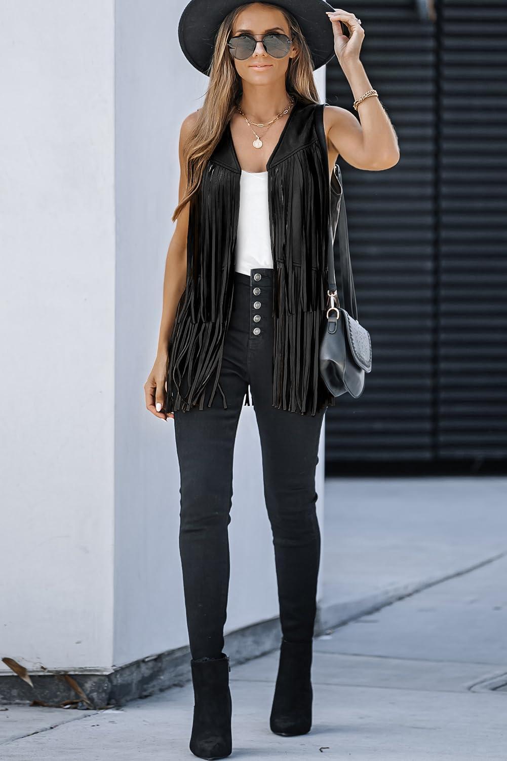 Dokotoo Womens Fringe Vest 70s Hippie Costume Sleeveless Cowgirl Western Outfits Faux Suede Tassel Leather Outerwear(Black)