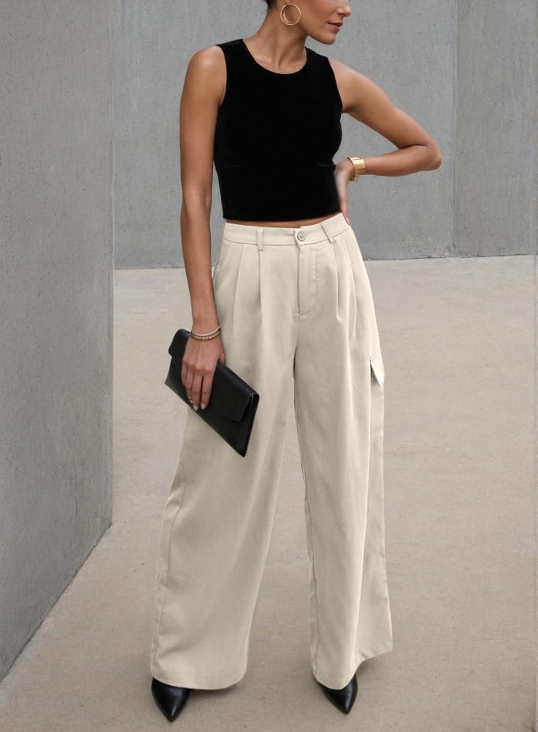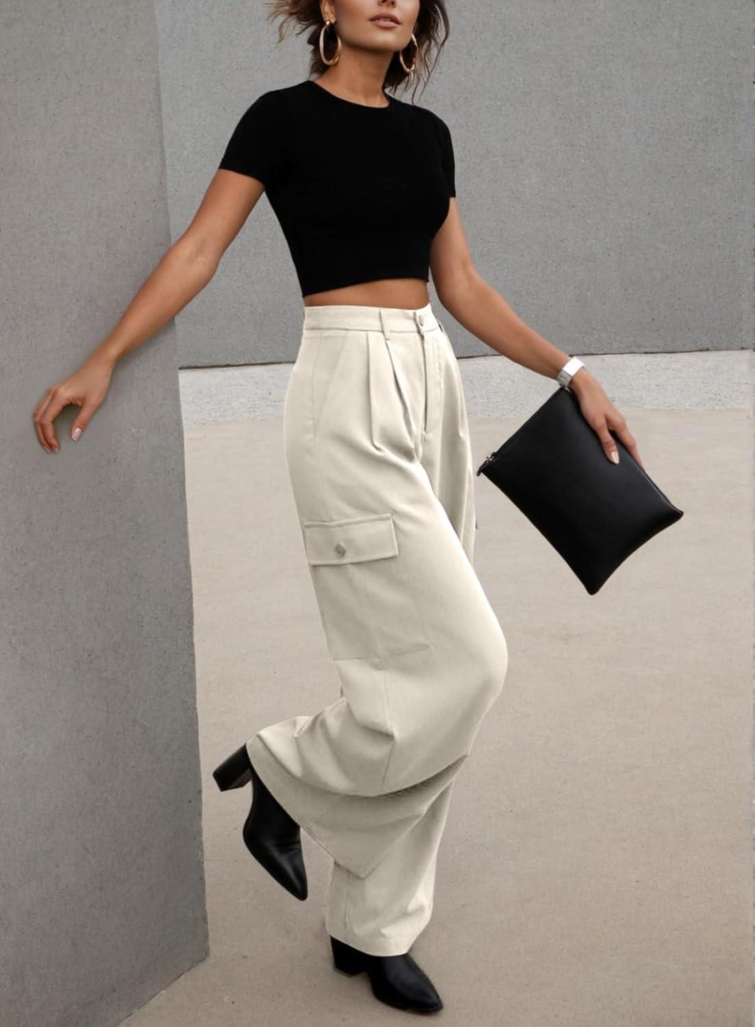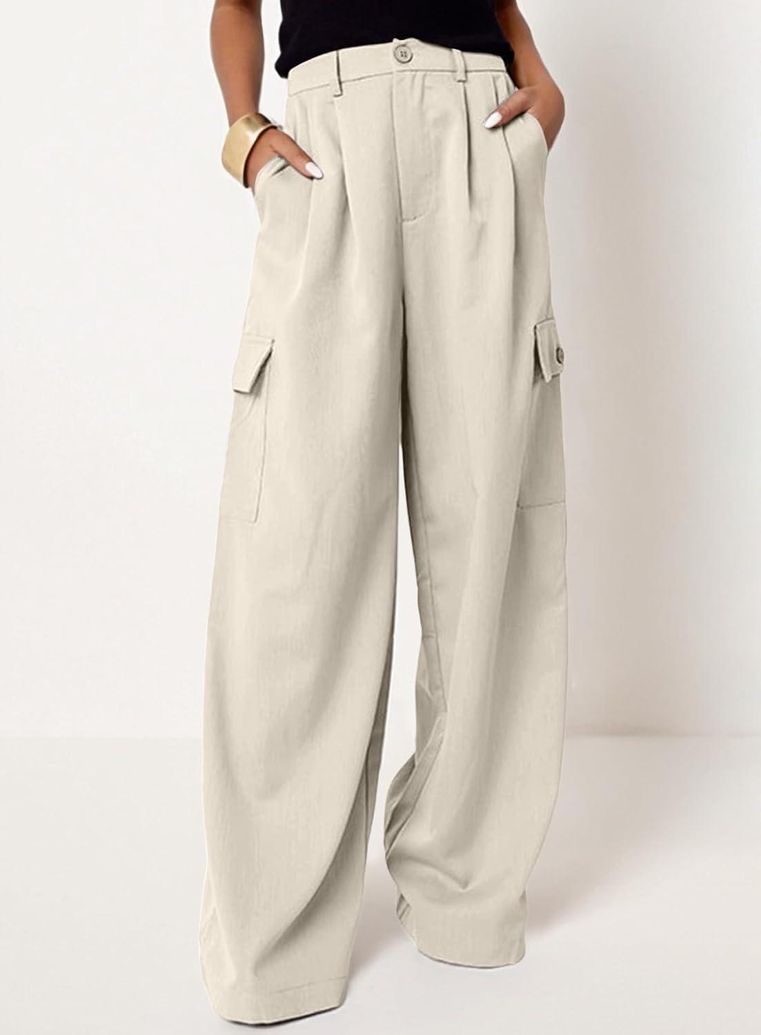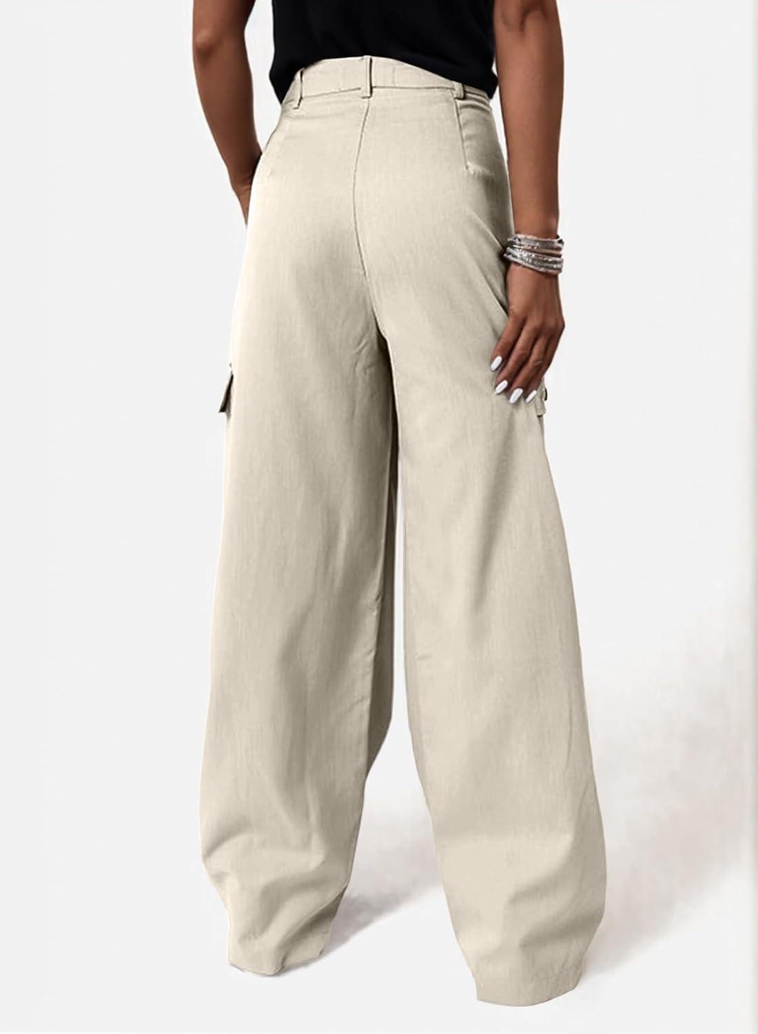 Dokotoo Womens High Waisted Wide Leg Cargo Pants Baggy Casual Trendy Work Pants with 4 Pockets(Beige)