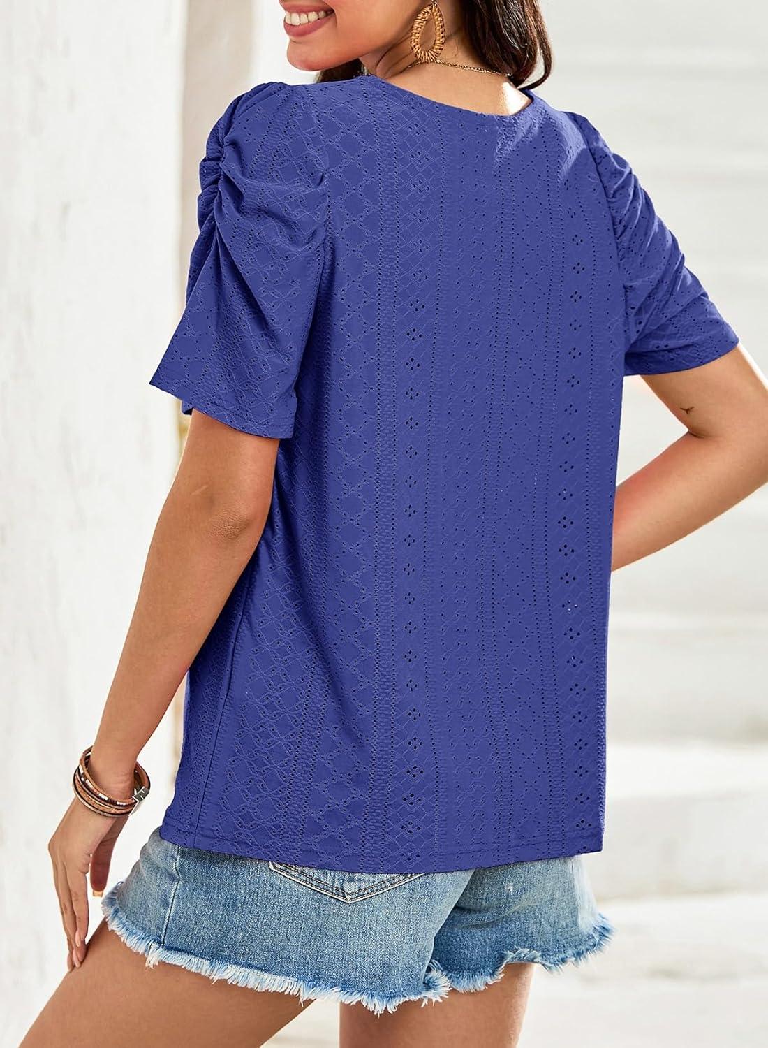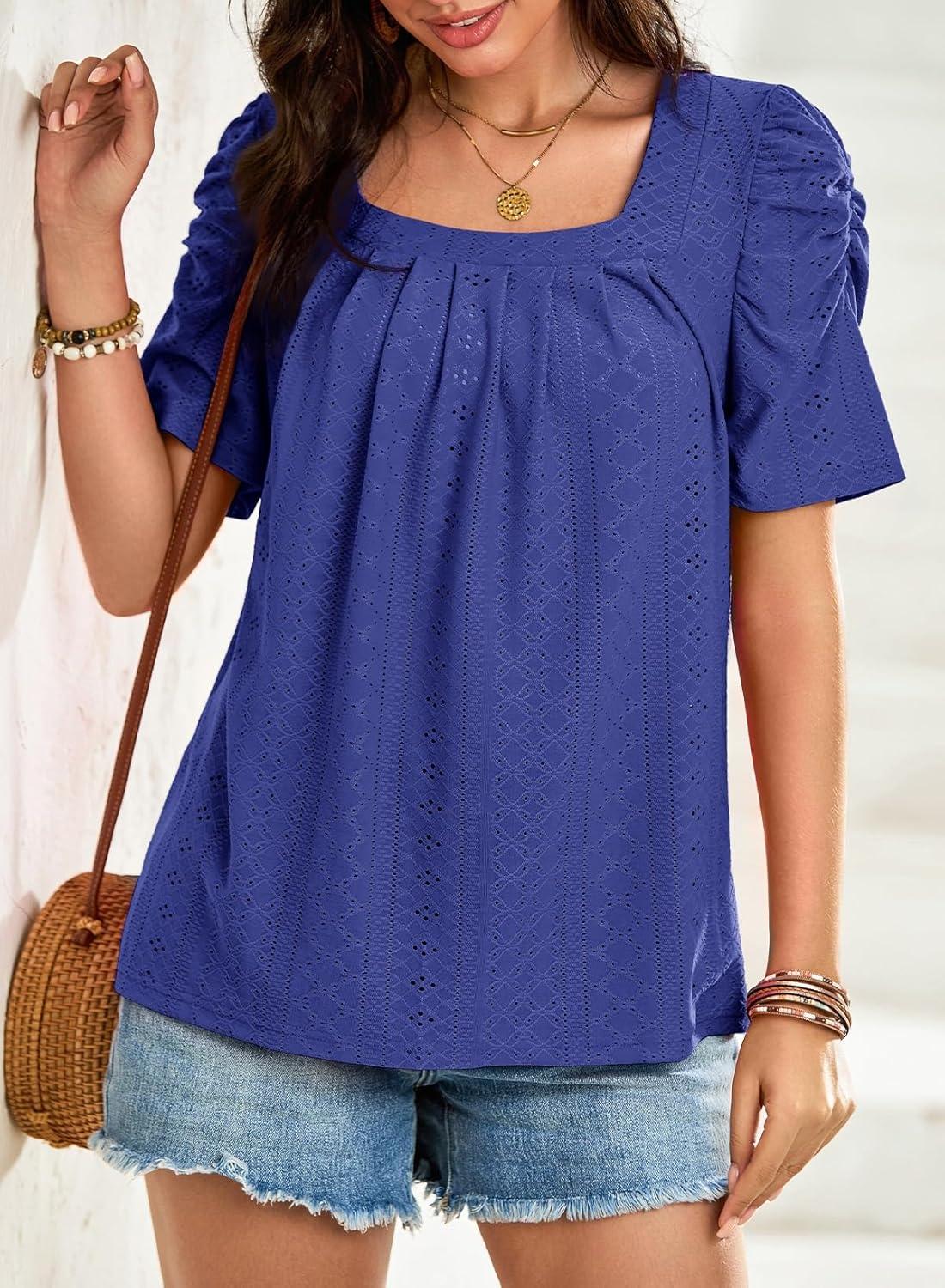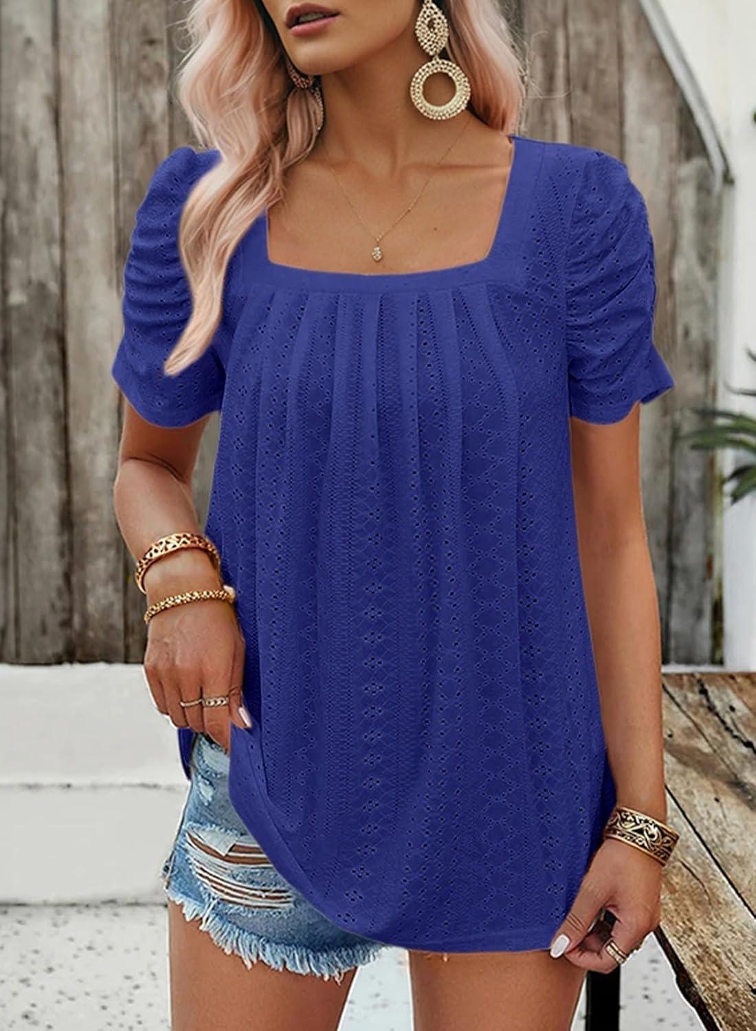 Dokotoo Women’s Hollow Pleated Short Sleeves Square Neck Casual Loose Solid Color Knit T Shirts Tops Blouses(Bluing)