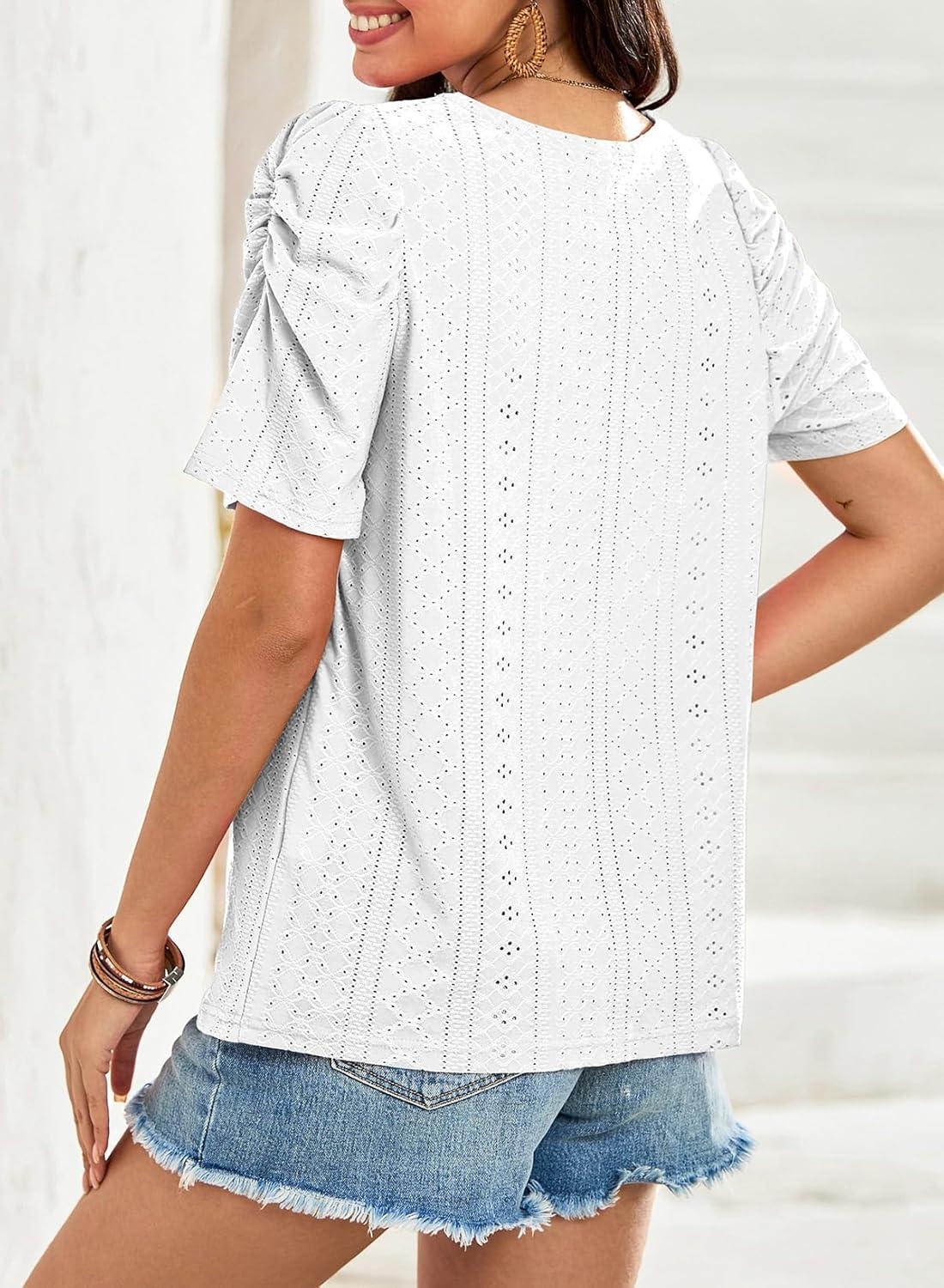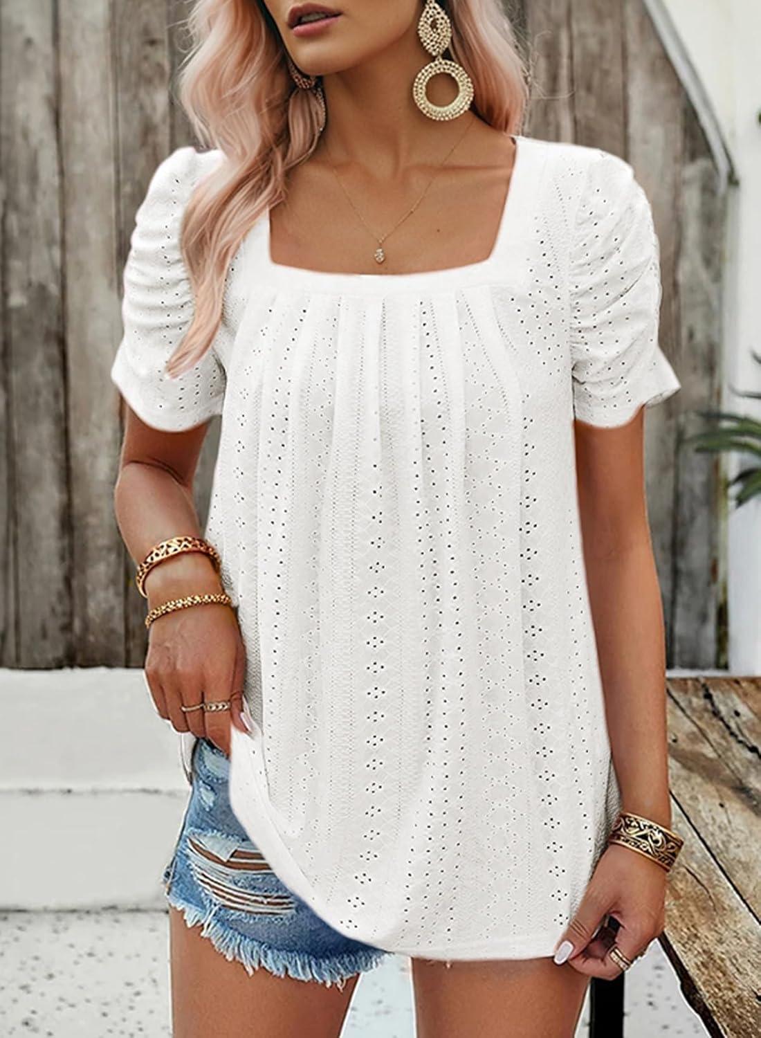 Dokotoo Women’s Hollow Pleated Short Sleeves Square Neck Casual Loose Solid Color Knit T Shirts Tops Blouses(White)