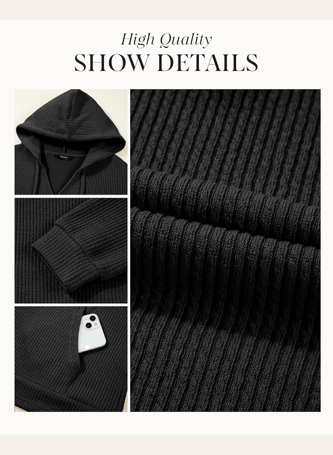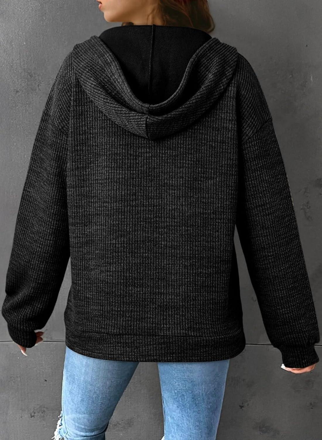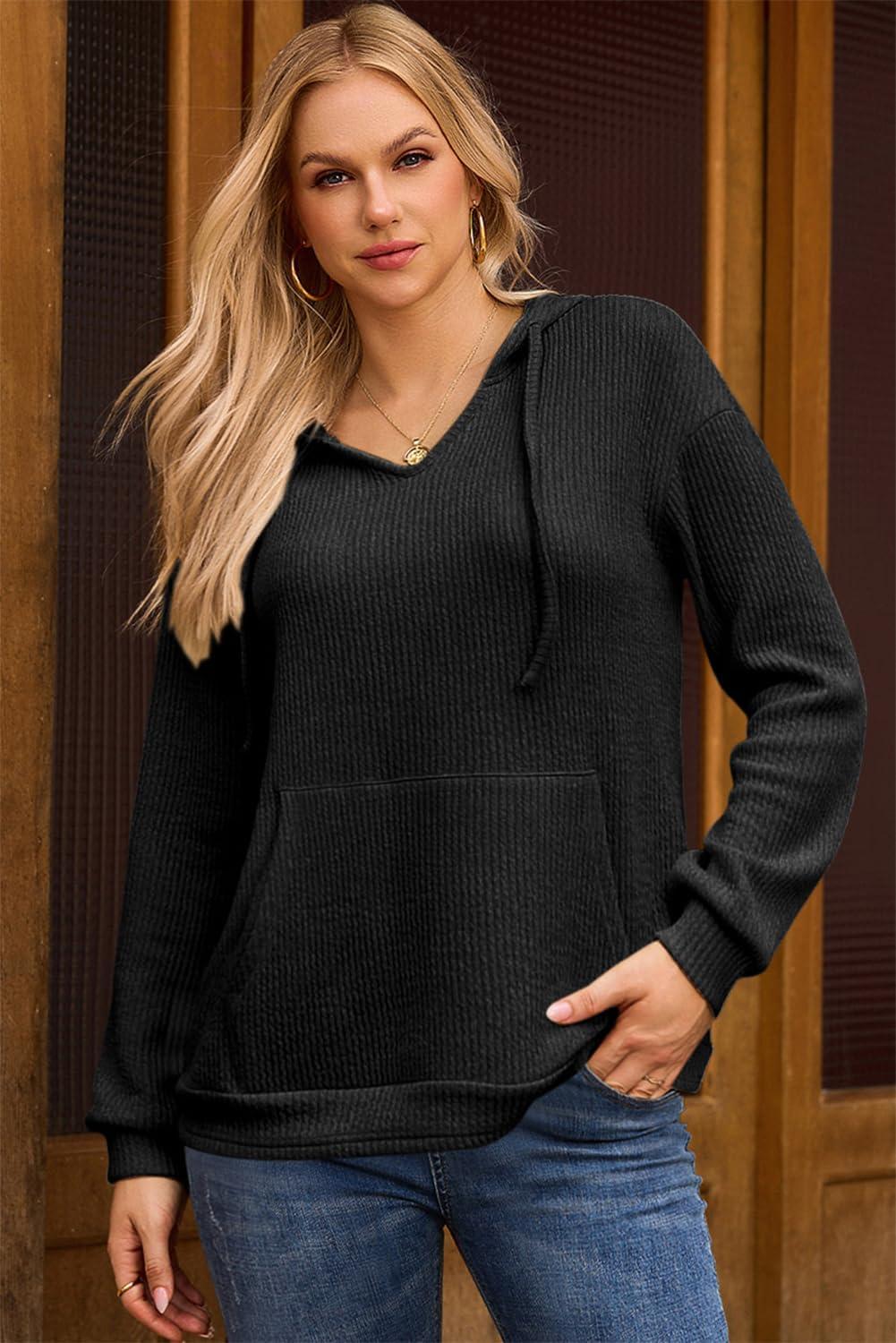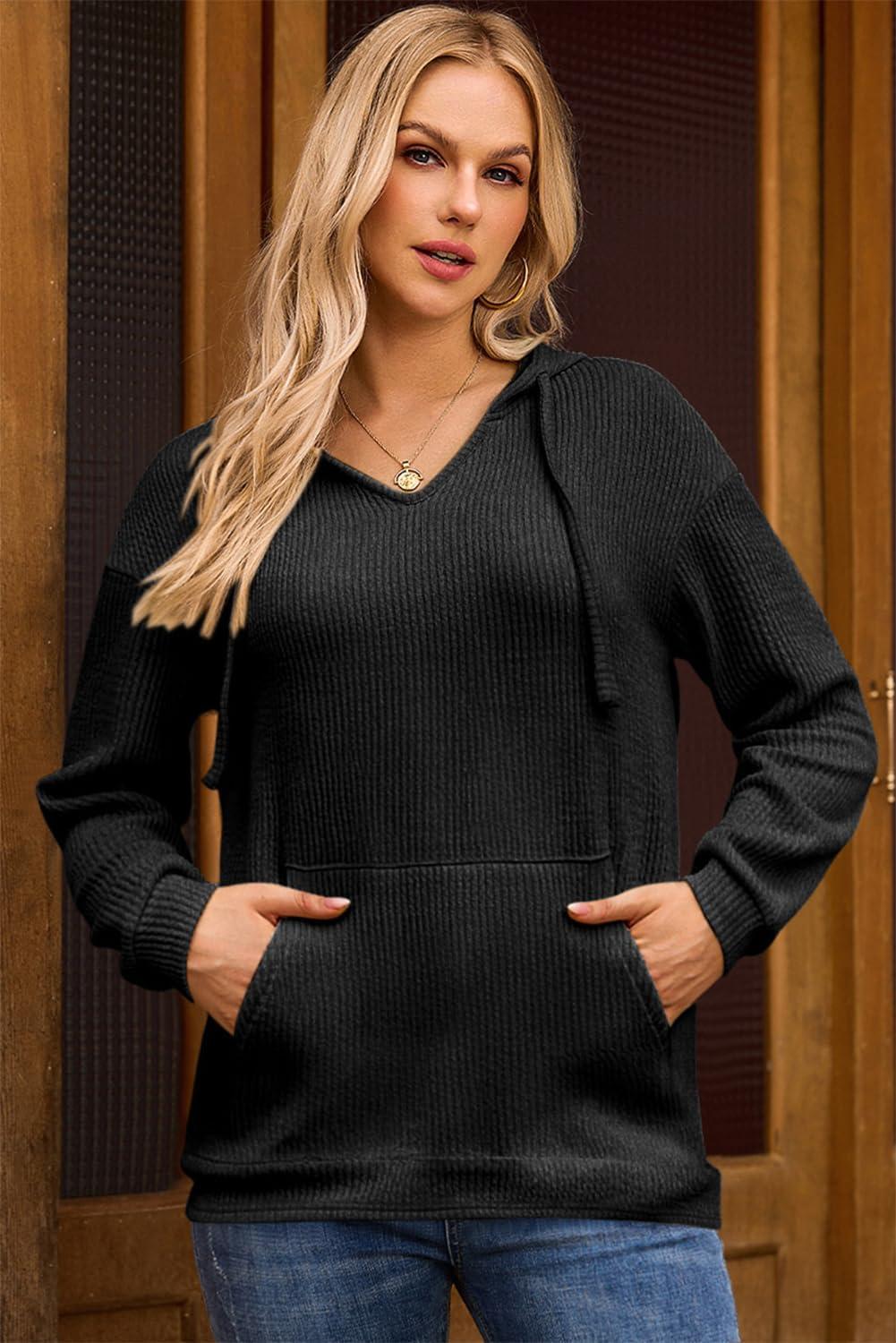 Dokotoo Womens Hoodies Oversized Sweatshirts Ribbed Knit Long Sleeve Drawstring V Neck Casual Pullover Sweatshirt Hooded Tops(Black)