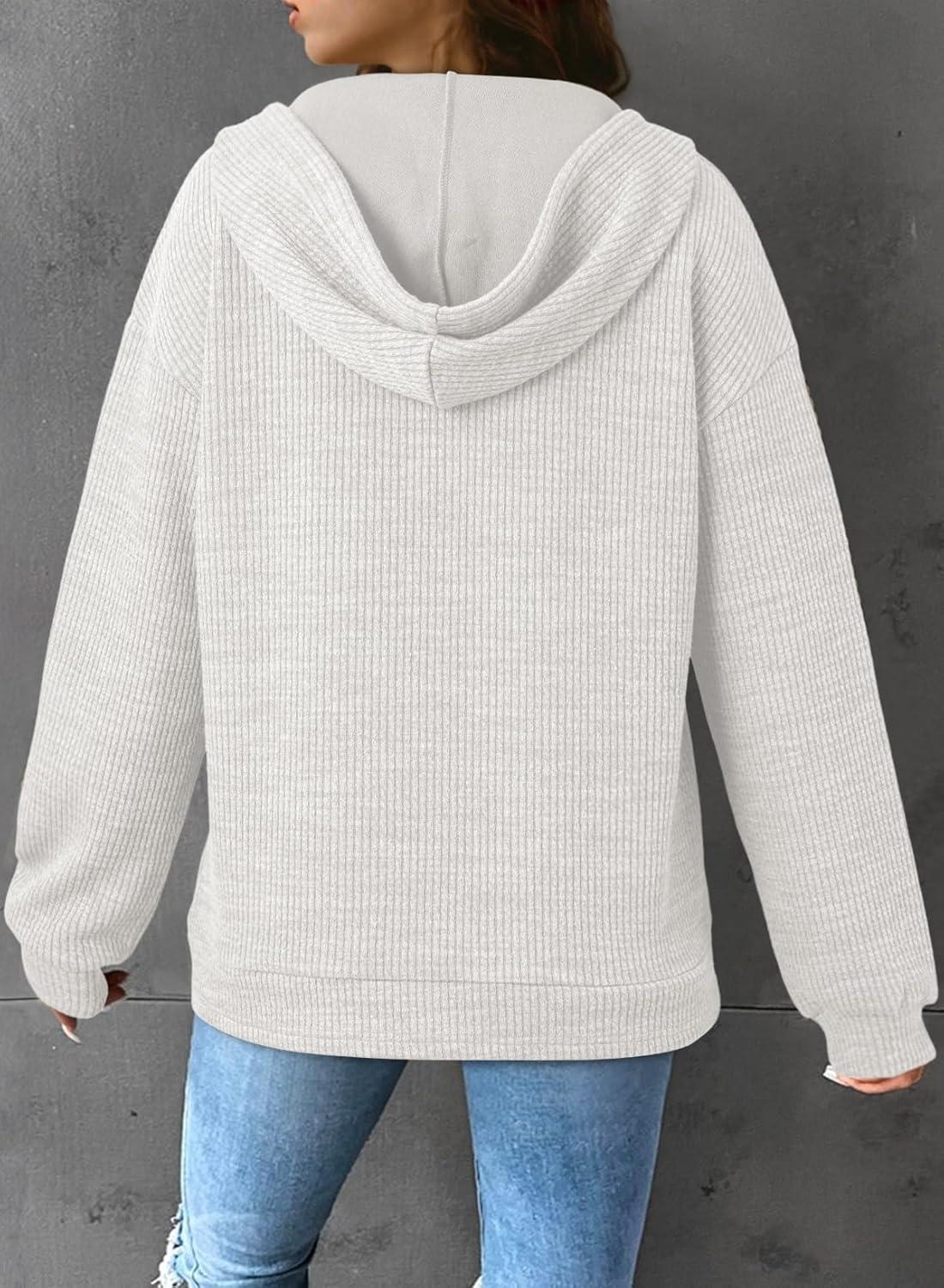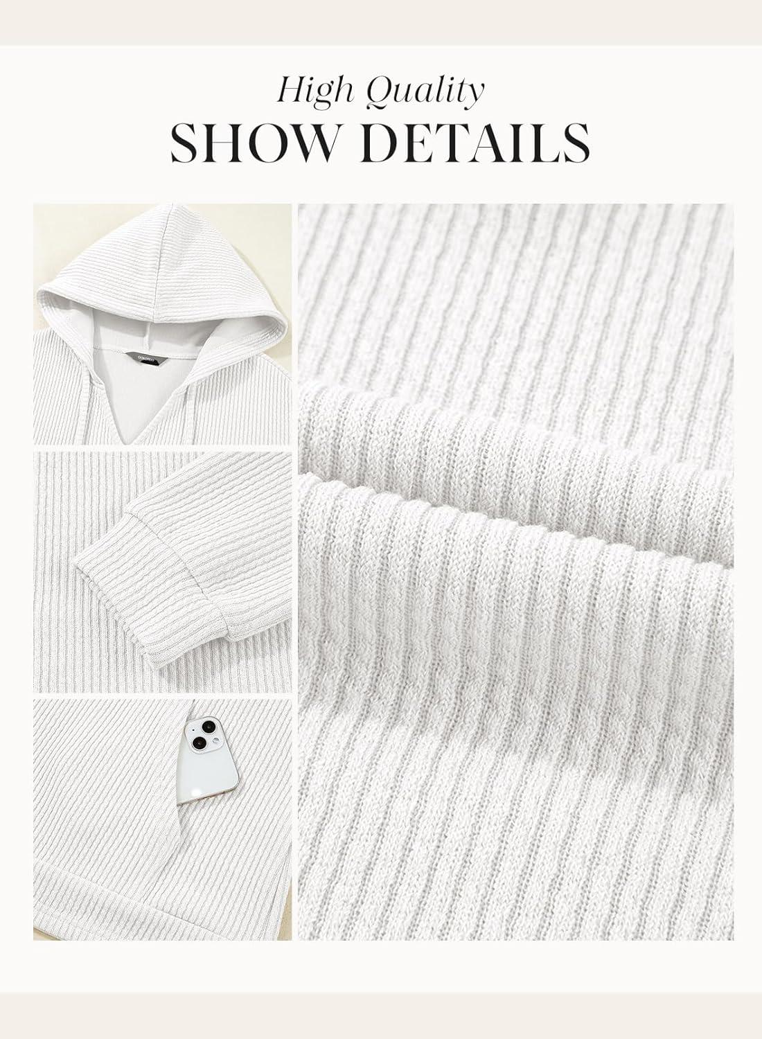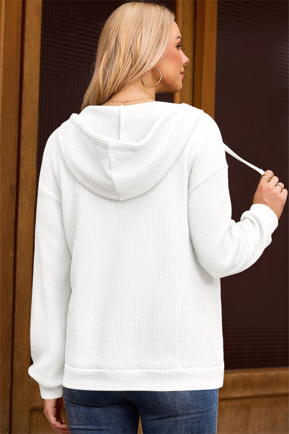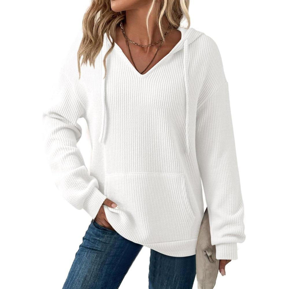 Dokotoo Womens Hoodies Oversized Sweatshirts Ribbed Knit Long Sleeve Drawstring V Neck Casual Pullover Sweatshirt Hooded Tops(White)