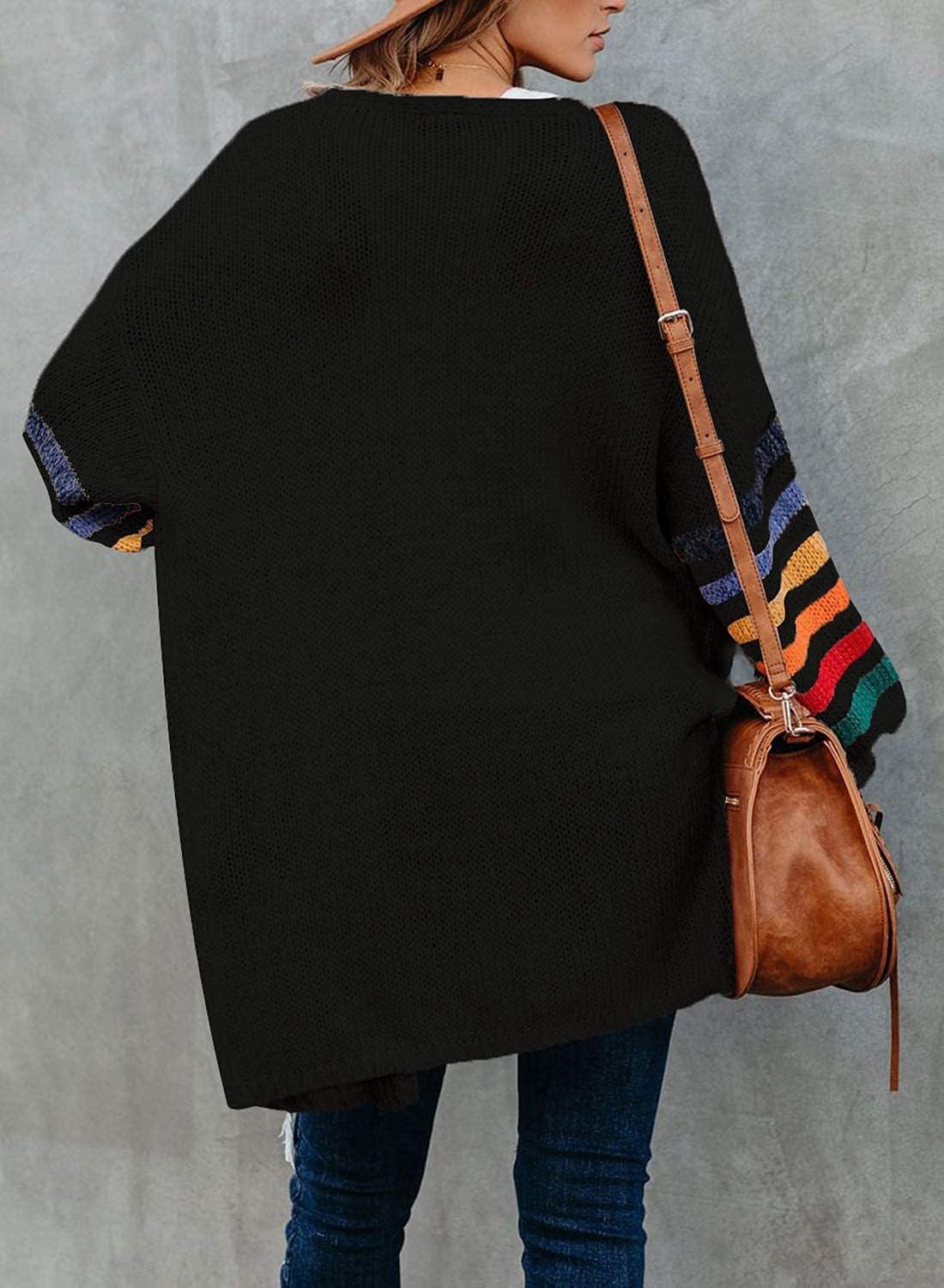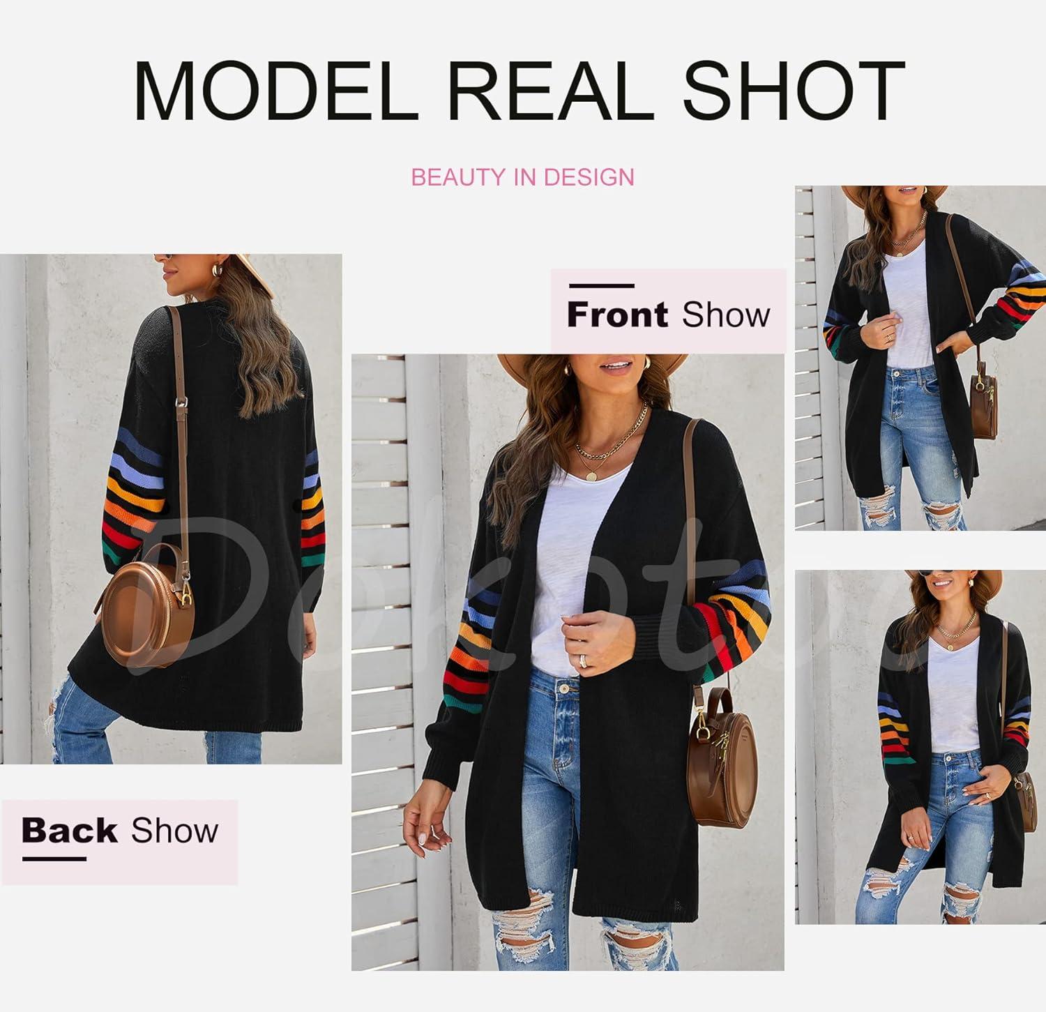 Dokotoo Women’s Long Open Front Cardigans Striped Color Block Loose Knit Sweaters Outwear Coat(A Black)