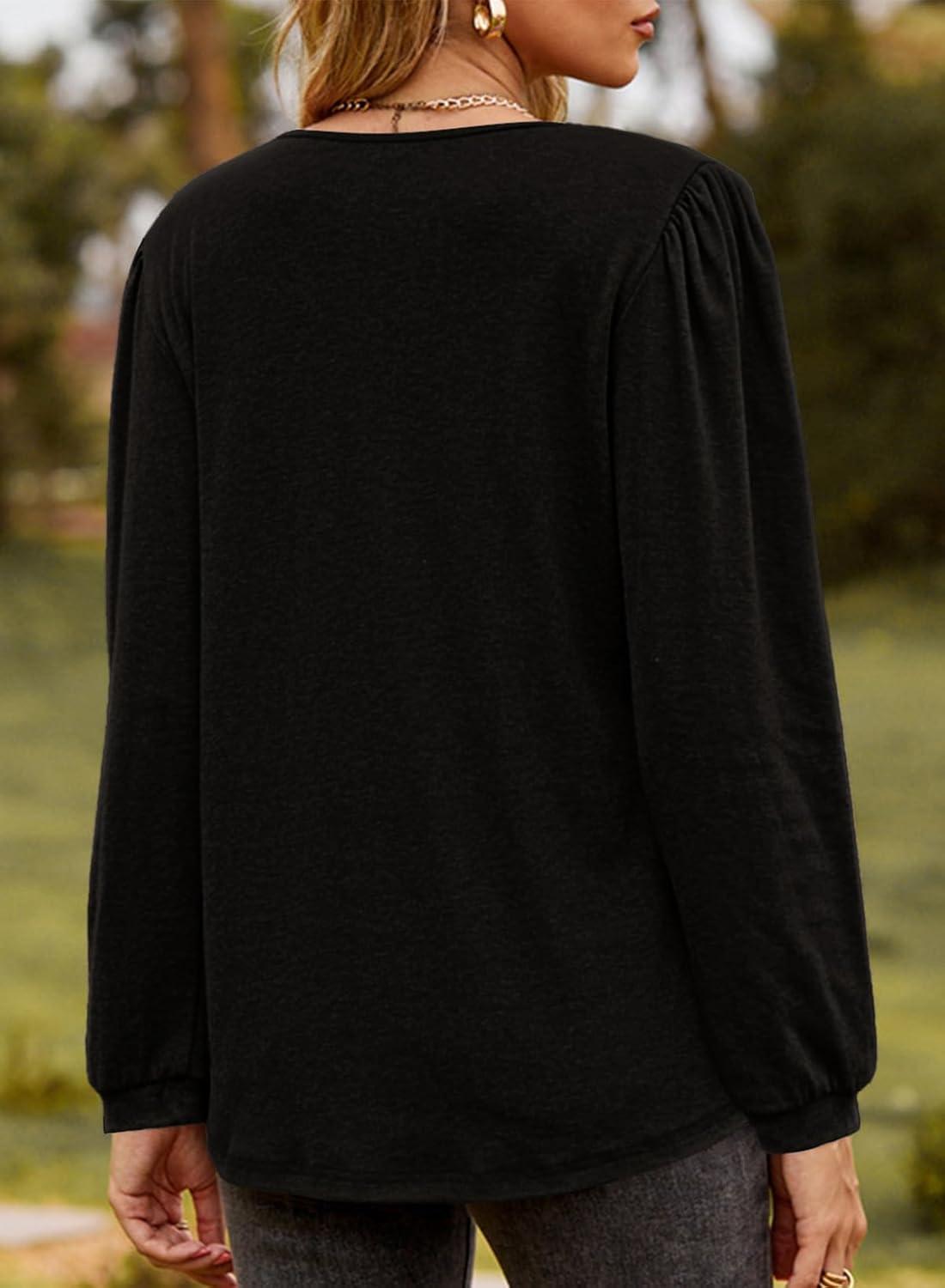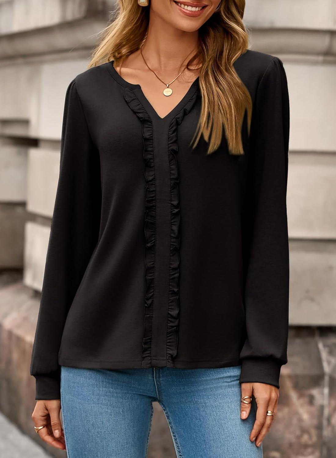 Dokotoo Womens Long Sleeve Tops Ruffle V Neck Shirts Dressy Casual Blouses Fall Clothes 2025(Black)