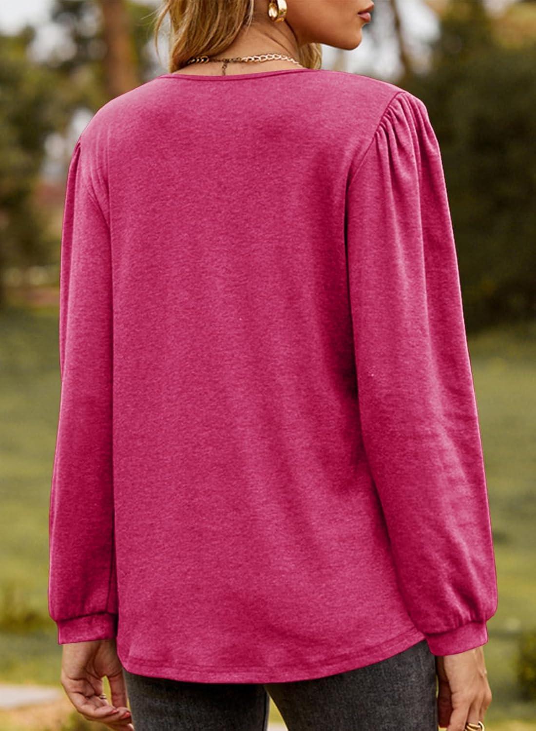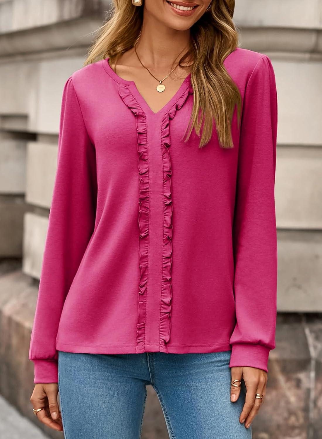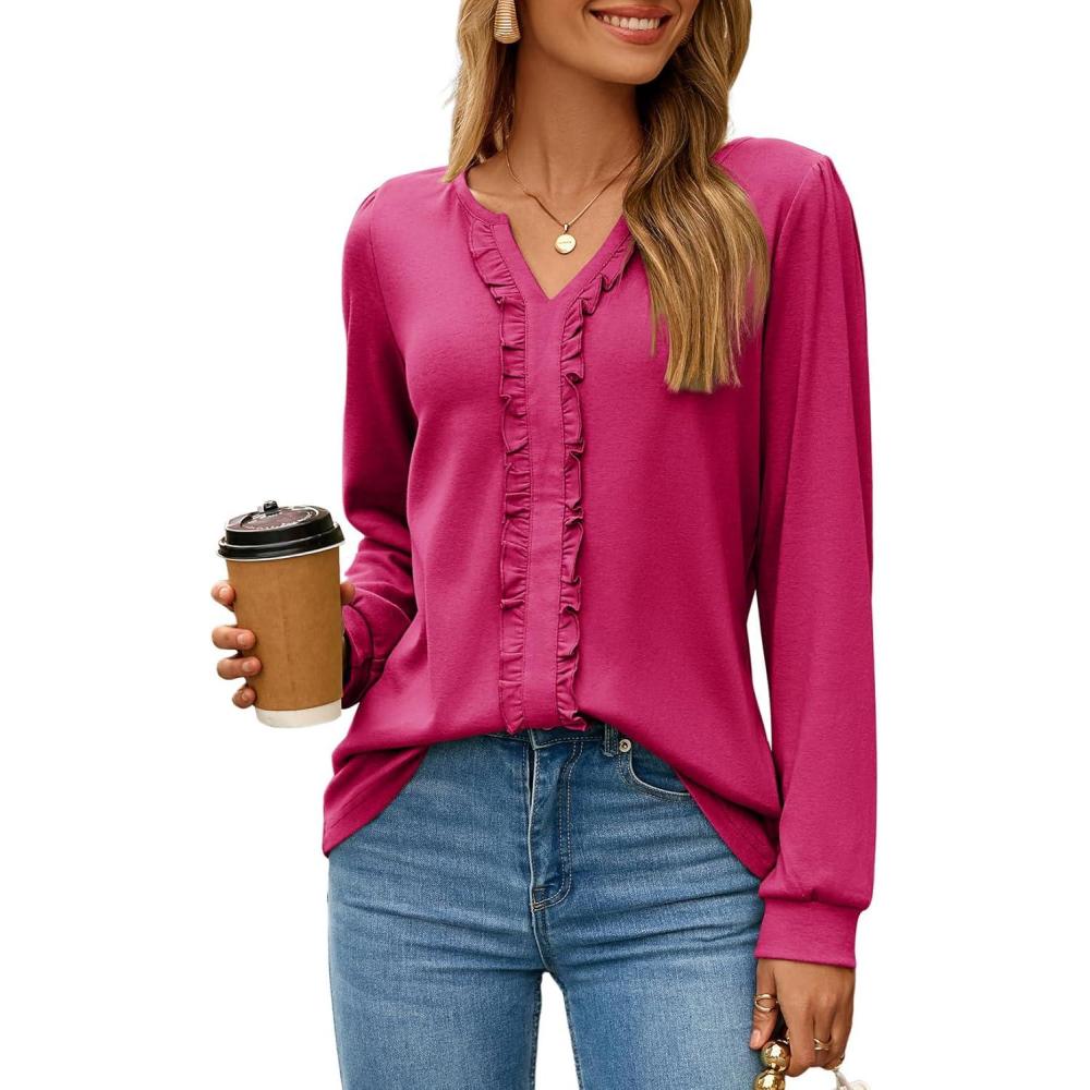 Dokotoo Womens Long Sleeve Tops Ruffle V Neck Shirts Dressy Casual Blouses Fall Clothes 2025(Rose Red)
