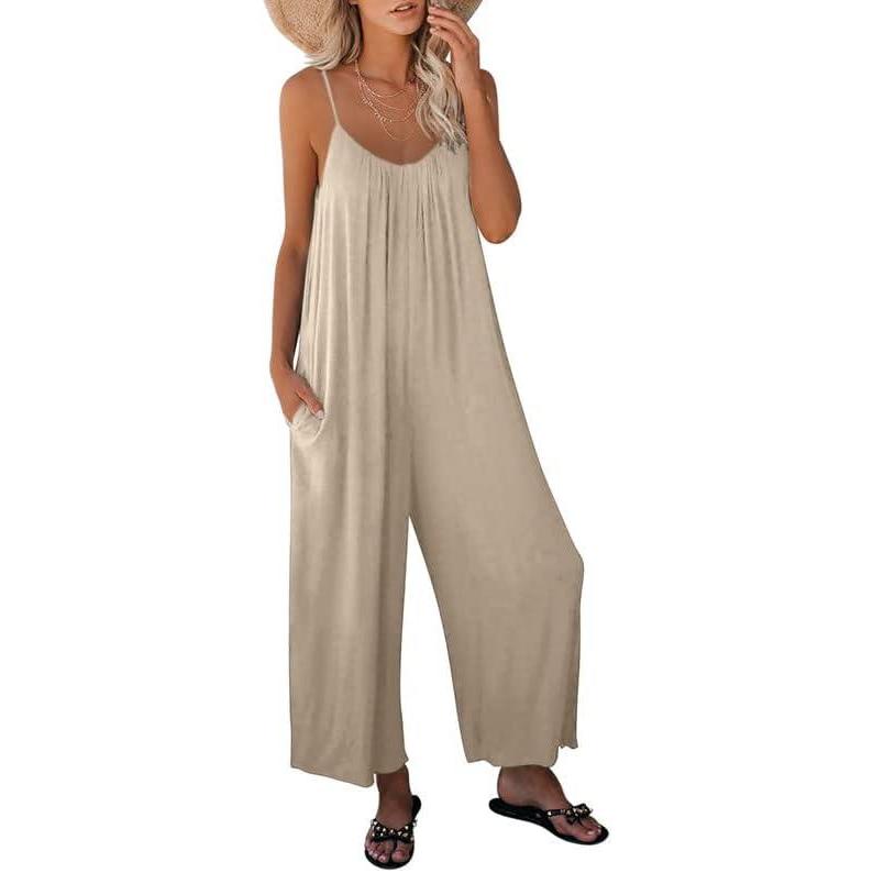 Dokotoo Women’s Loose Sleeveless Jumpsuits Adjustable Spaghetti Strap Stretchy Long Pant Romper Jumpsuit with Pockets(A Apricot)