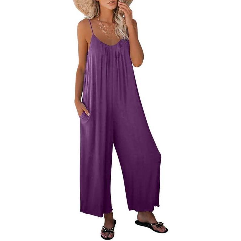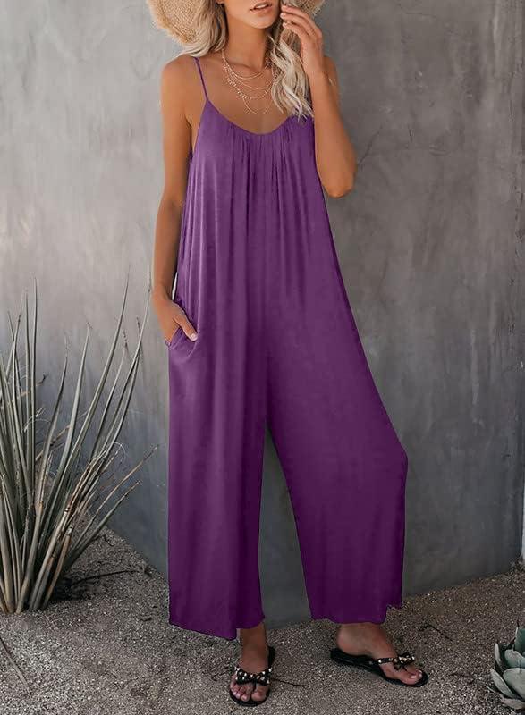Dokotoo Women’s Loose Sleeveless Jumpsuits Adjustable Spaghetti Strap Stretchy Long Pant Romper Jumpsuit with Pockets(A Deep Purple)