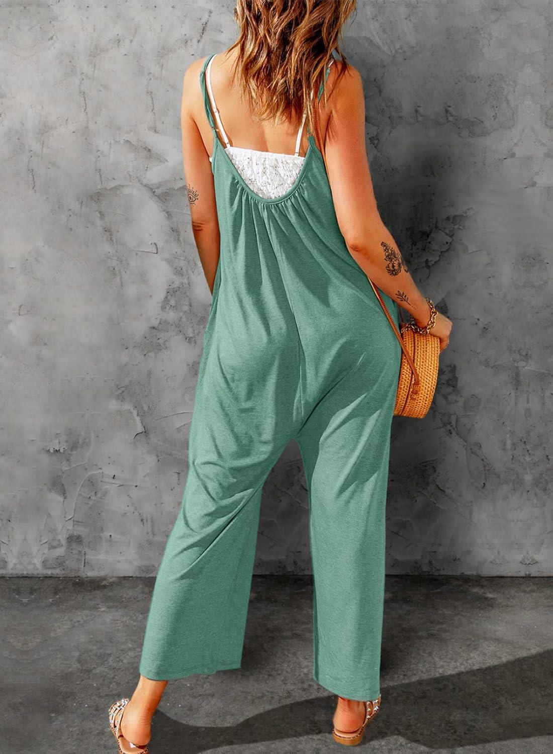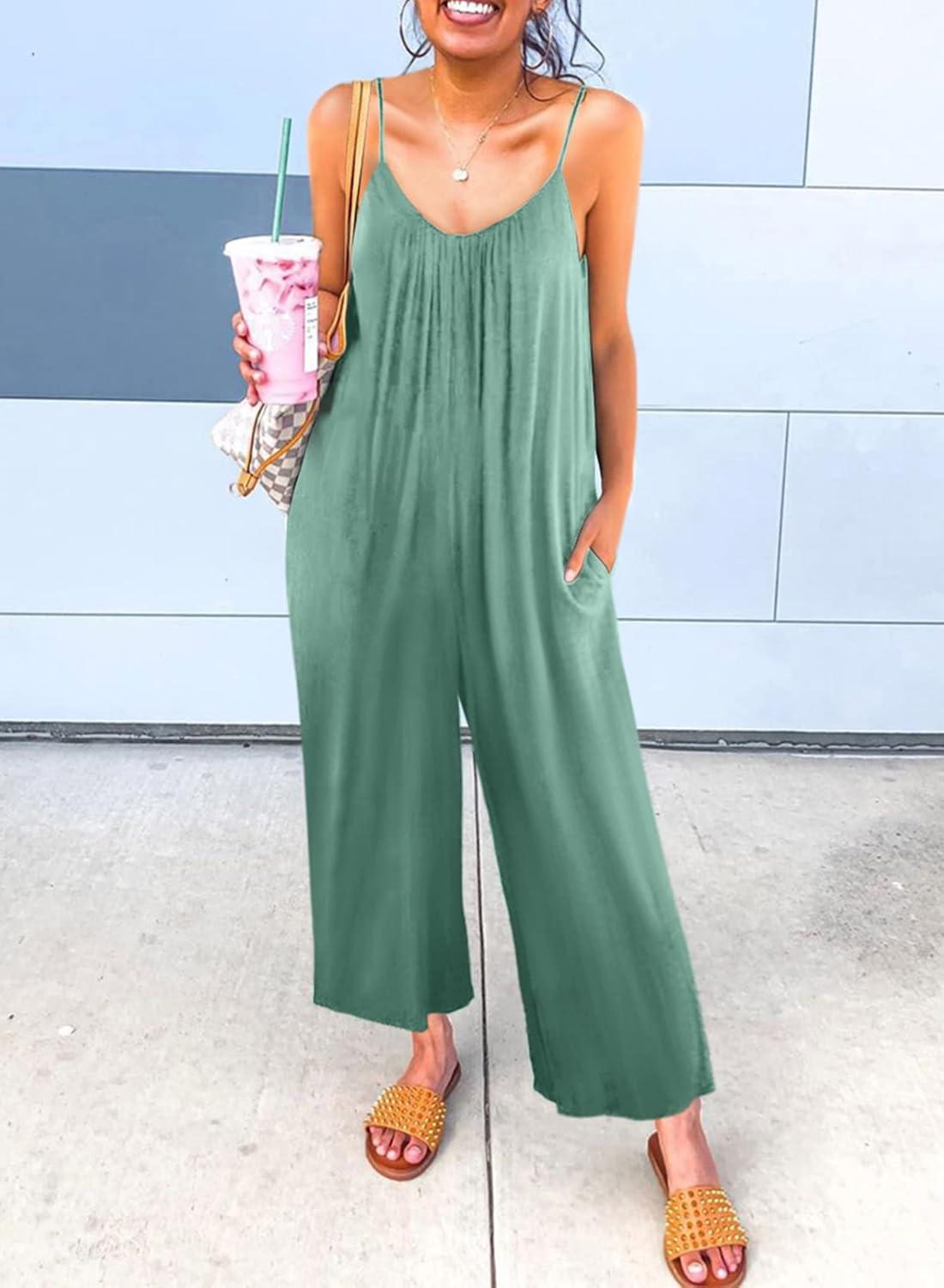 Dokotoo Women’s Loose Sleeveless Jumpsuits Adjustable Spaghetti Strap Stretchy Long Pant Romper Jumpsuit with Pockets(A Pattern Green)