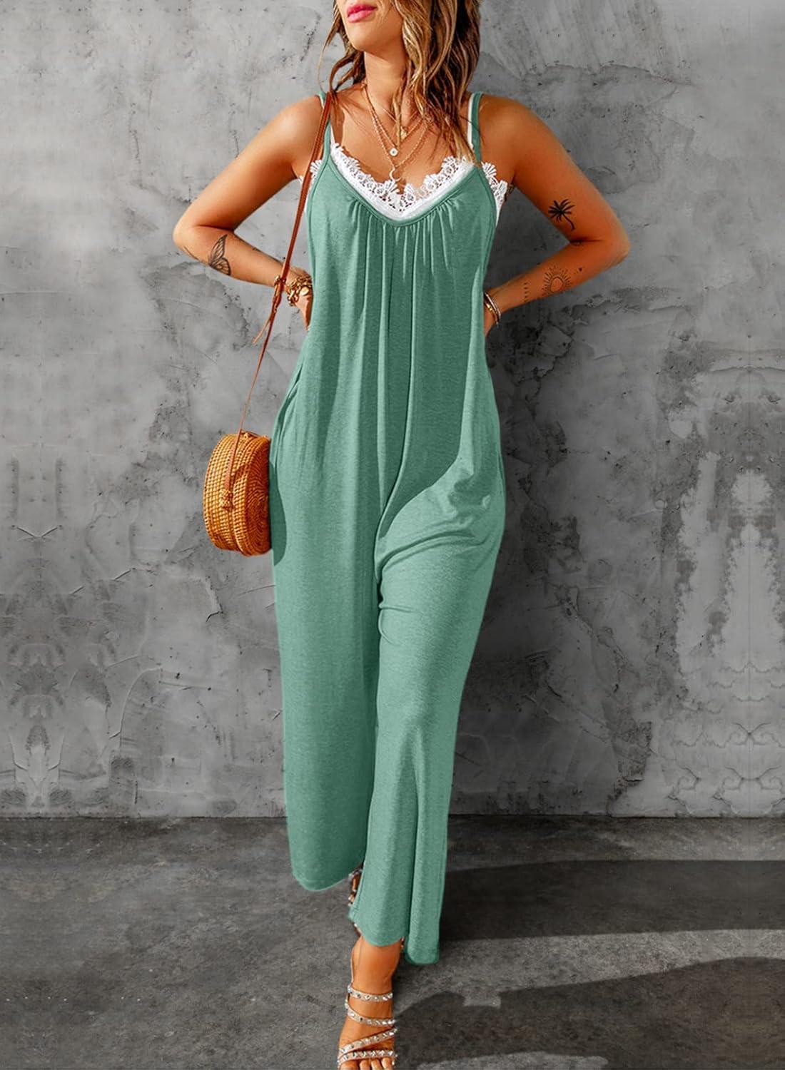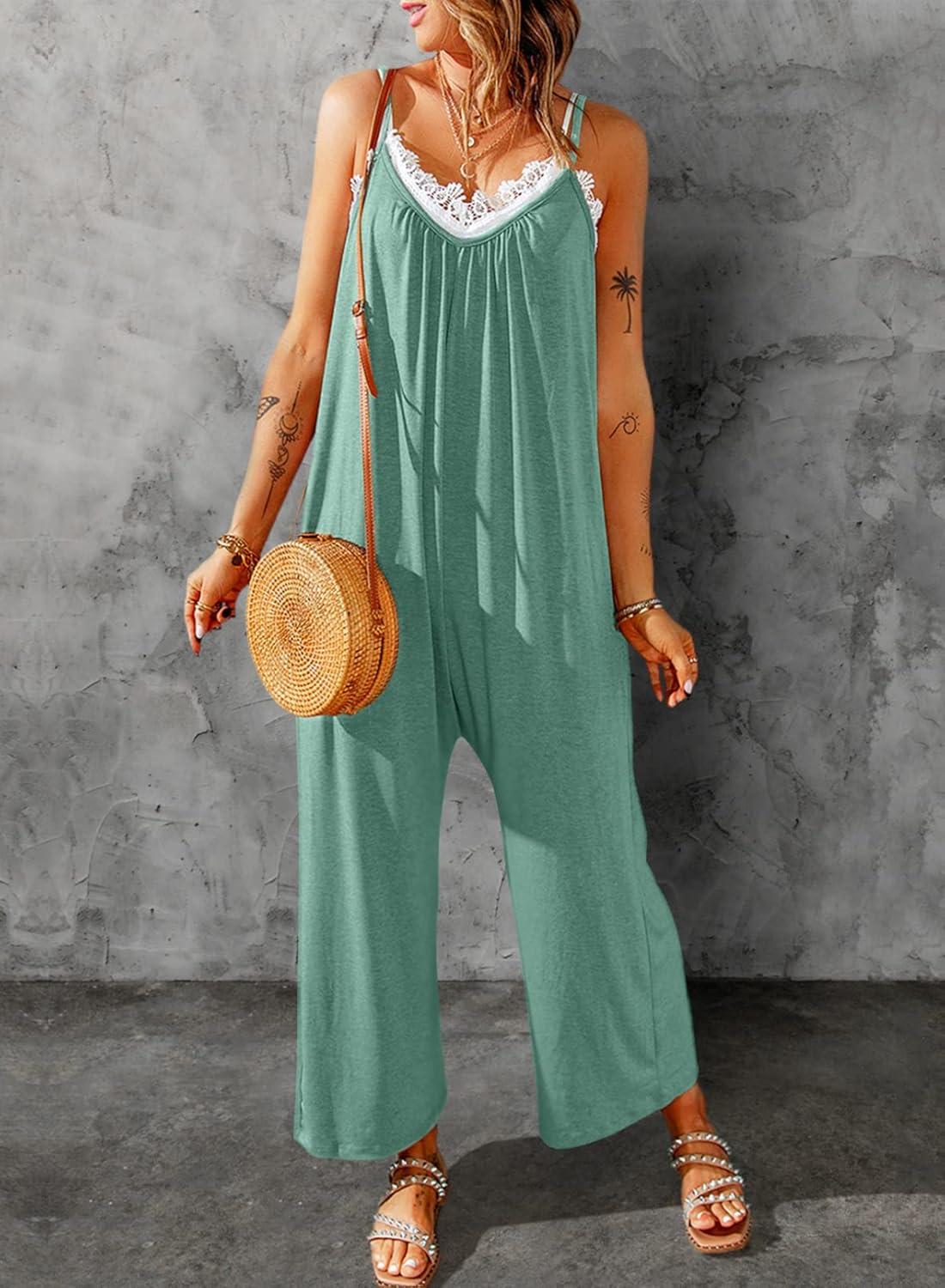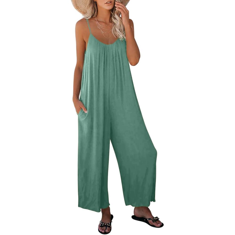 Dokotoo Women’s Loose Sleeveless Jumpsuits Adjustable Spaghetti Strap Stretchy Long Pant Romper Jumpsuit with Pockets(A Mint Green 2)