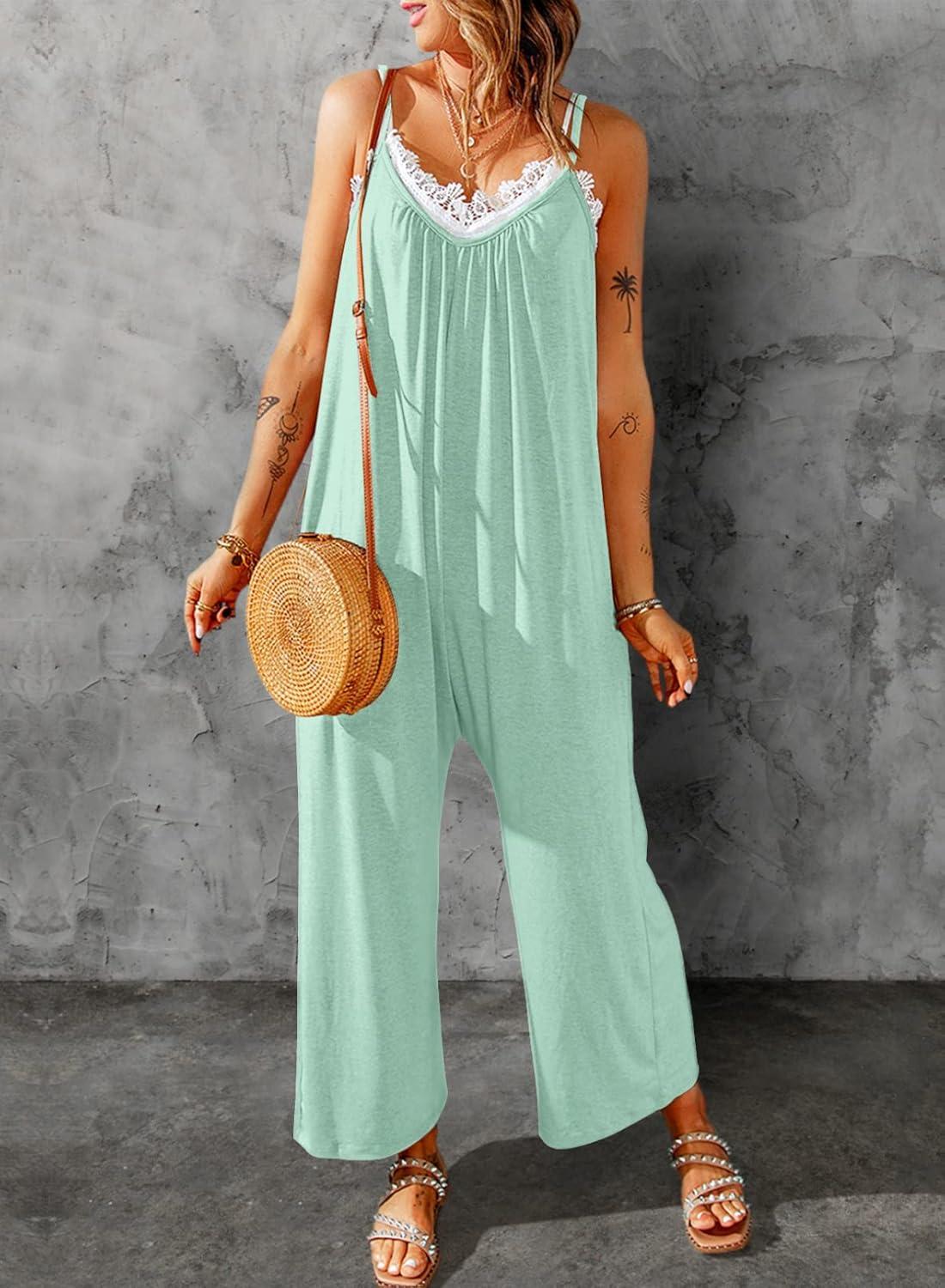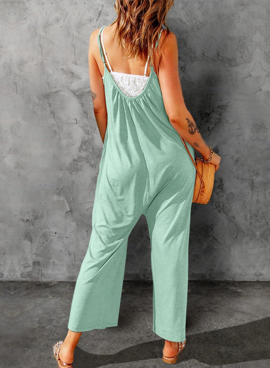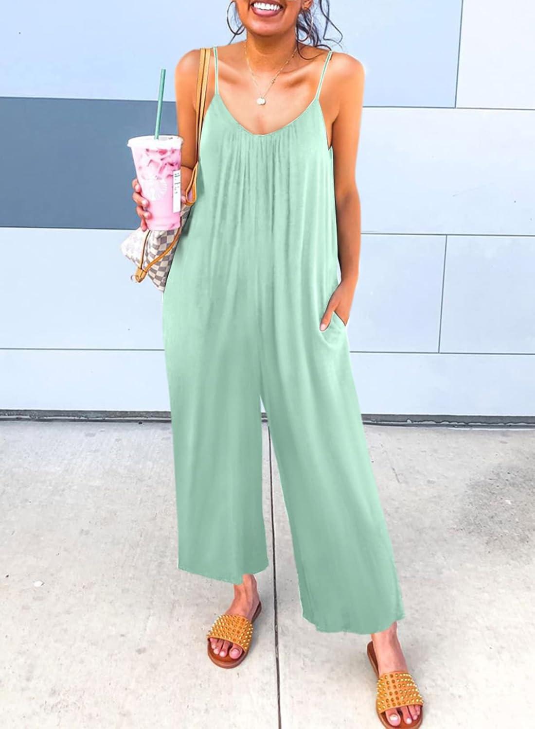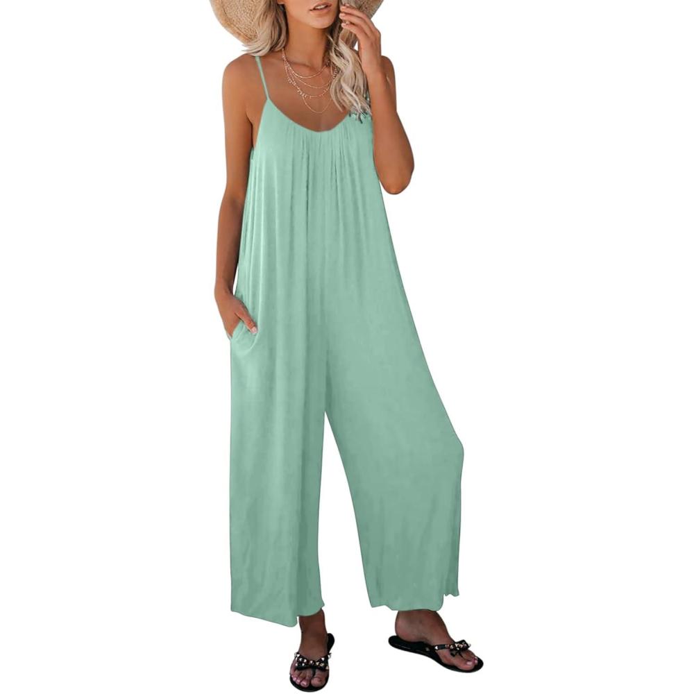 Dokotoo Women’s Loose Sleeveless Jumpsuits Adjustable Spaghetti Strap Stretchy Long Pant Romper Jumpsuit with Pockets(A Mint Green)